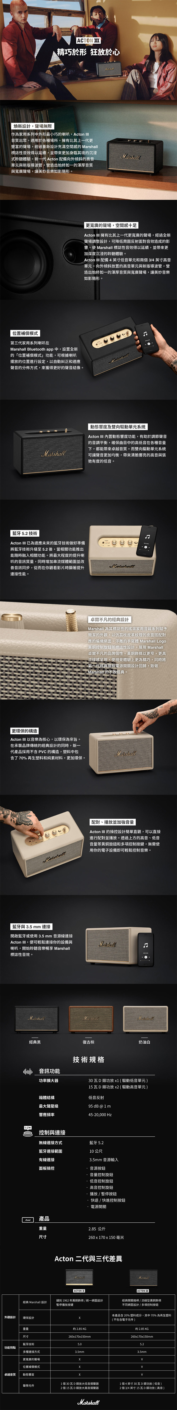 MARSHALL 標誌性音質,空間感十足的音效動態音量配對、播放並加強音量藍牙5.2更環保的構造,70% 再生塑料3.5 毫米音源輸入ActonIII音質出眾,適用於各種場所新一代Acton配備向外傾斜的高音單元與新版導波管