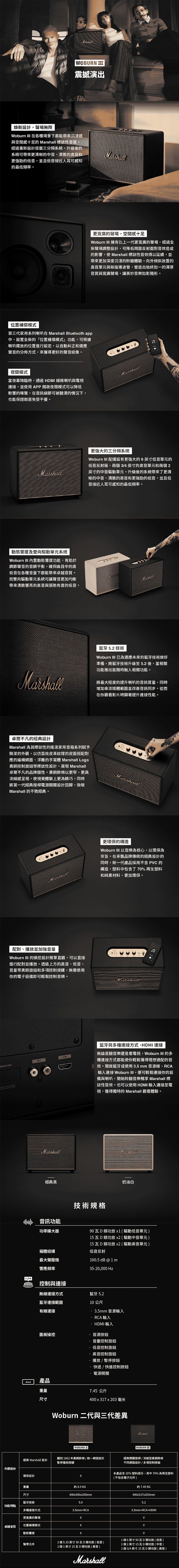 功率擴大器:一個90 瓦D 類功放用以驅動低音單元。 兩個15 瓦D 類功放用以驅動中音單元。 兩個15 瓦D 類功放用以驅動高音單元。箱體結構:低音反射響應頻率:35至20,000 Hz尺寸:400 x 317 x 203 毫米重量:7.45 公斤NCC:CCAH21LP7490T2BSMI:R38900低音與高音客製化:使用音箱調節旋鈕調製你的專屬音樂藍牙:5.2藍牙連接範圍:10 公尺有線連接:3.5 毫米輸入端、RCA 輸入、HDMI 輸入包裝內容物:Woburn III 喇叭、用戶手冊及法律與安全資訊、電源線電源輸入:100至240 V