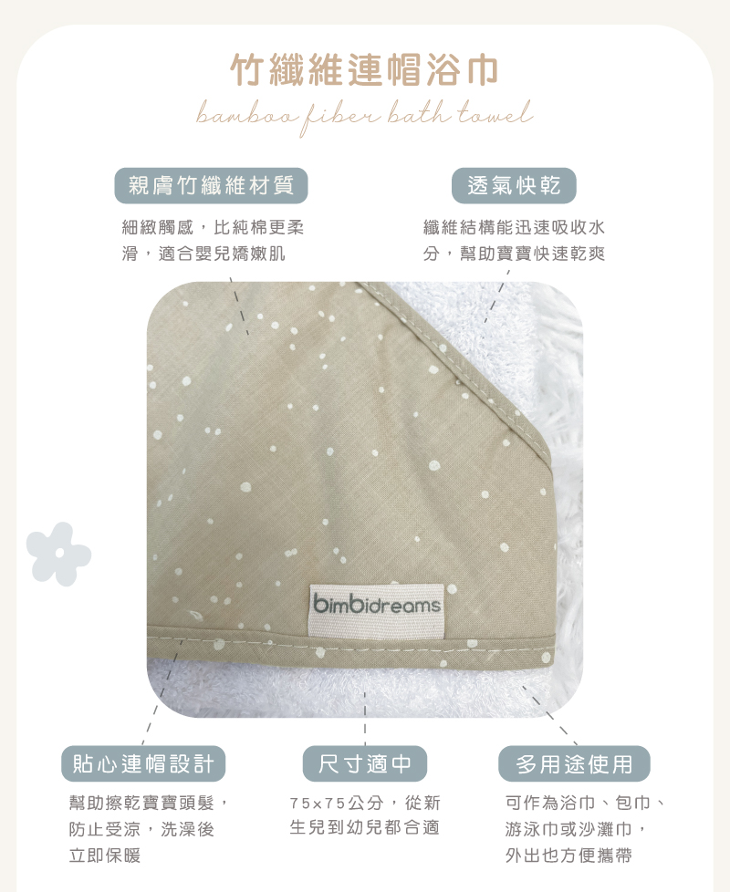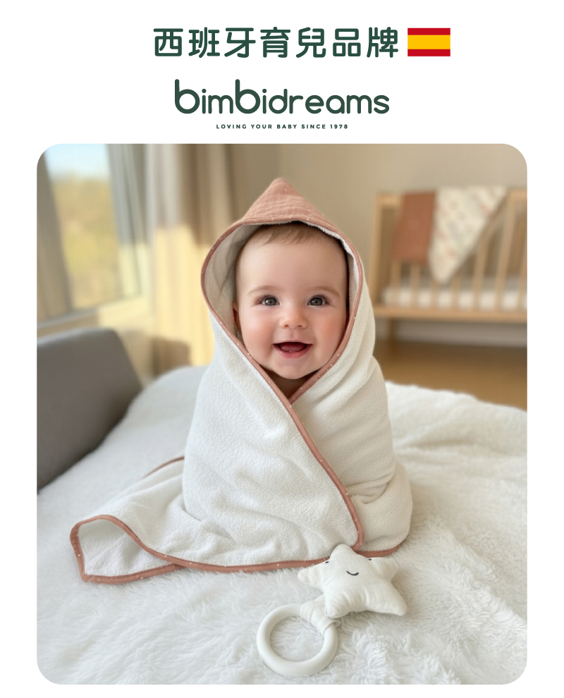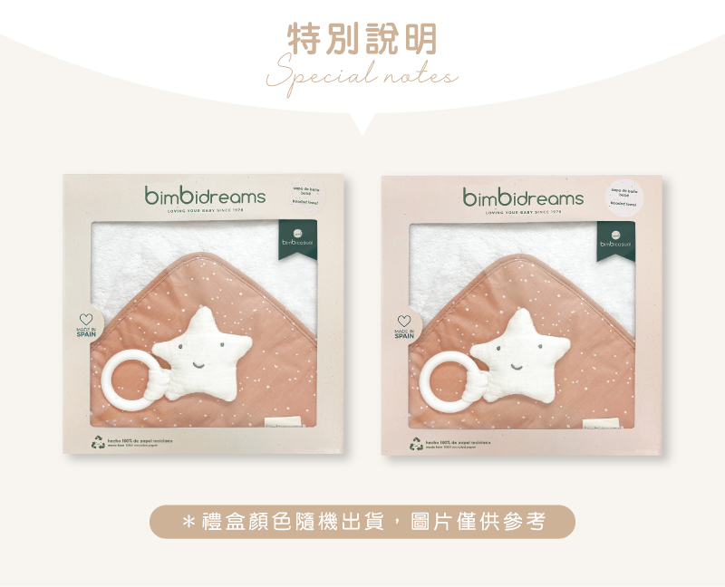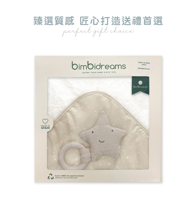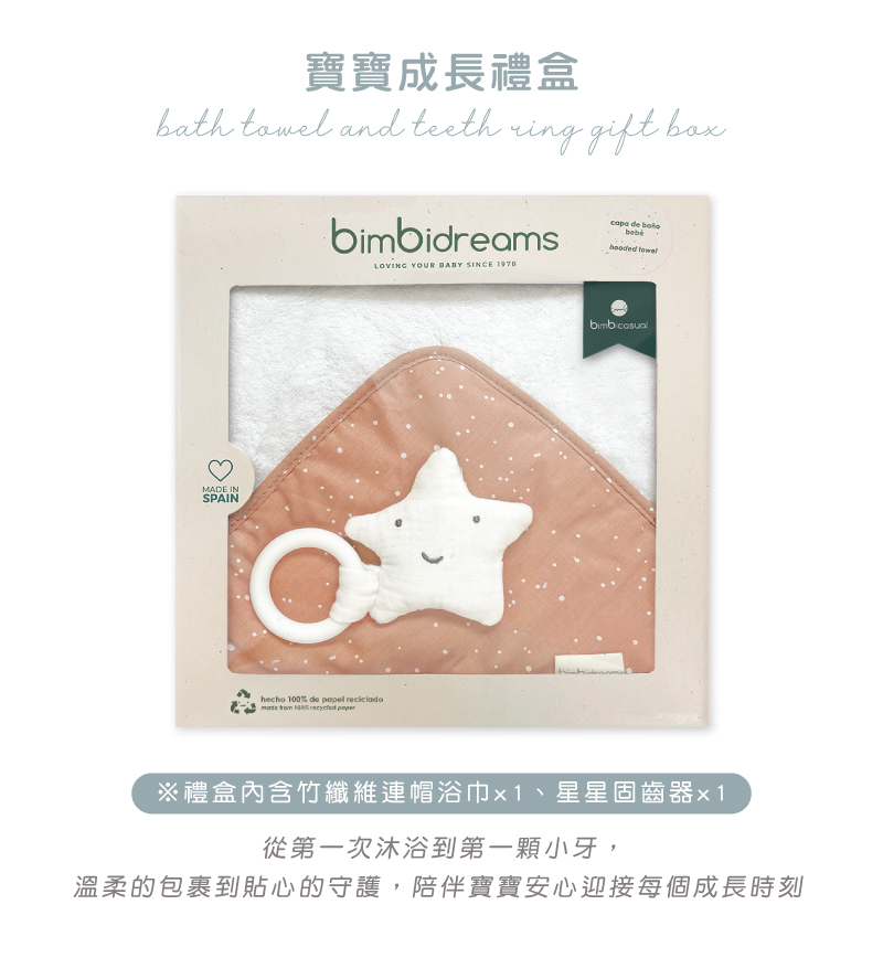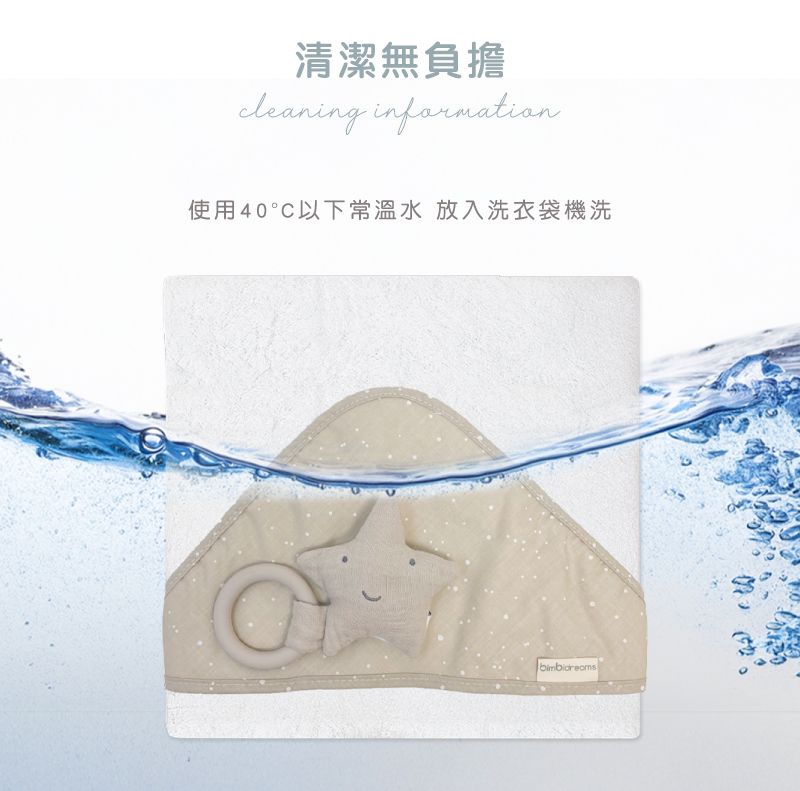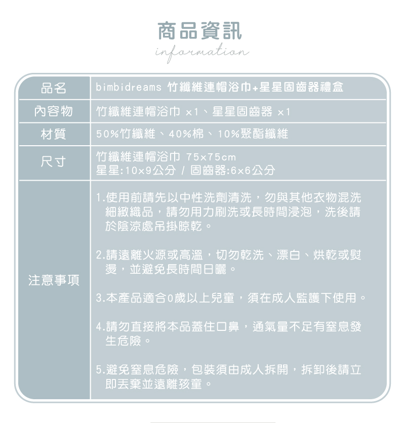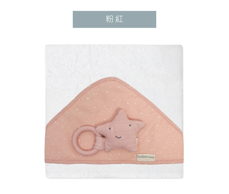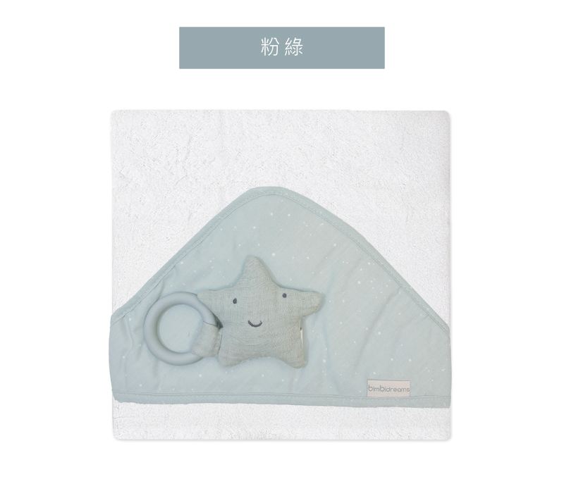1.用柔軟舒適的"BBD竹纖維連帽浴巾+星星固齒器"溫柔呵護您的寶寶。