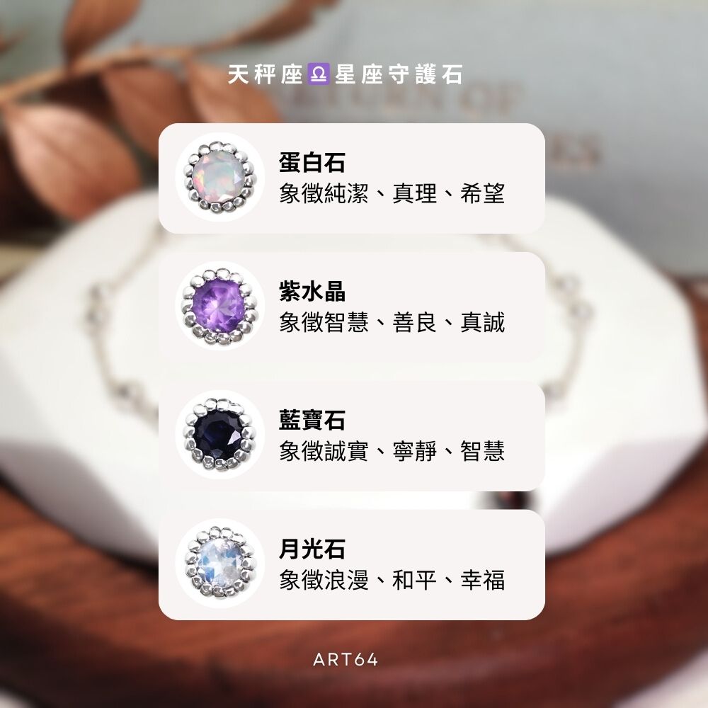 可依照喜好任選一款天秤座守護石:藍寶石、蛋白石、紫水晶、月光石