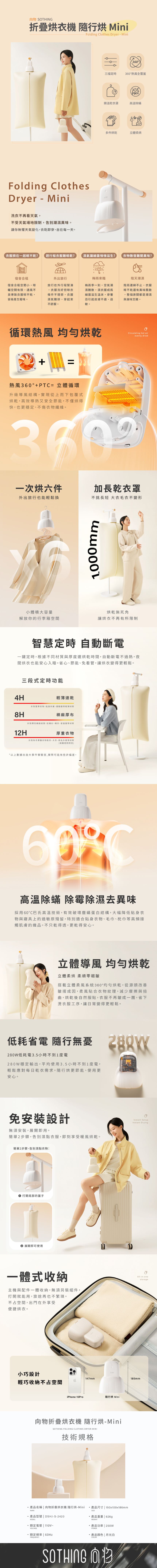 ◆商品內容【產品規格】品牌名稱:SOTHING 向物產品名稱:向物折疊烘衣機 隨行烘Mini產品型號:DSHJ-S-2420產品尺寸:150 x 100 x 186 mm額定電壓:110V額定頻率:60Hz產品功率:250W產品重量:626 gBSMI:R45673