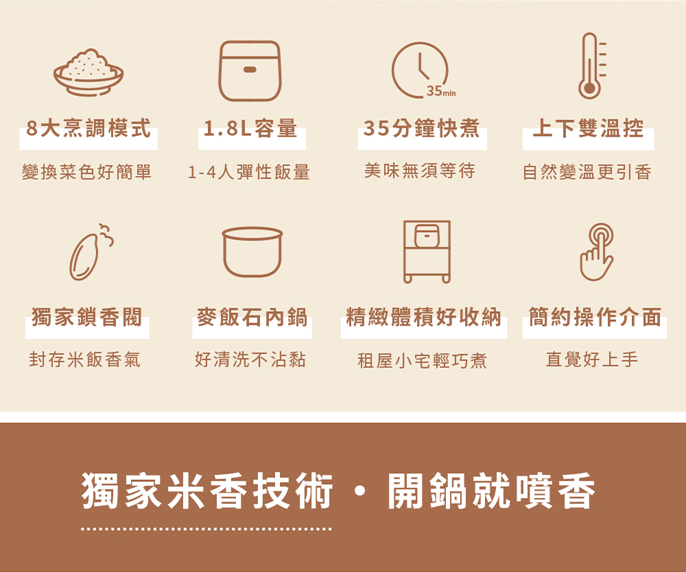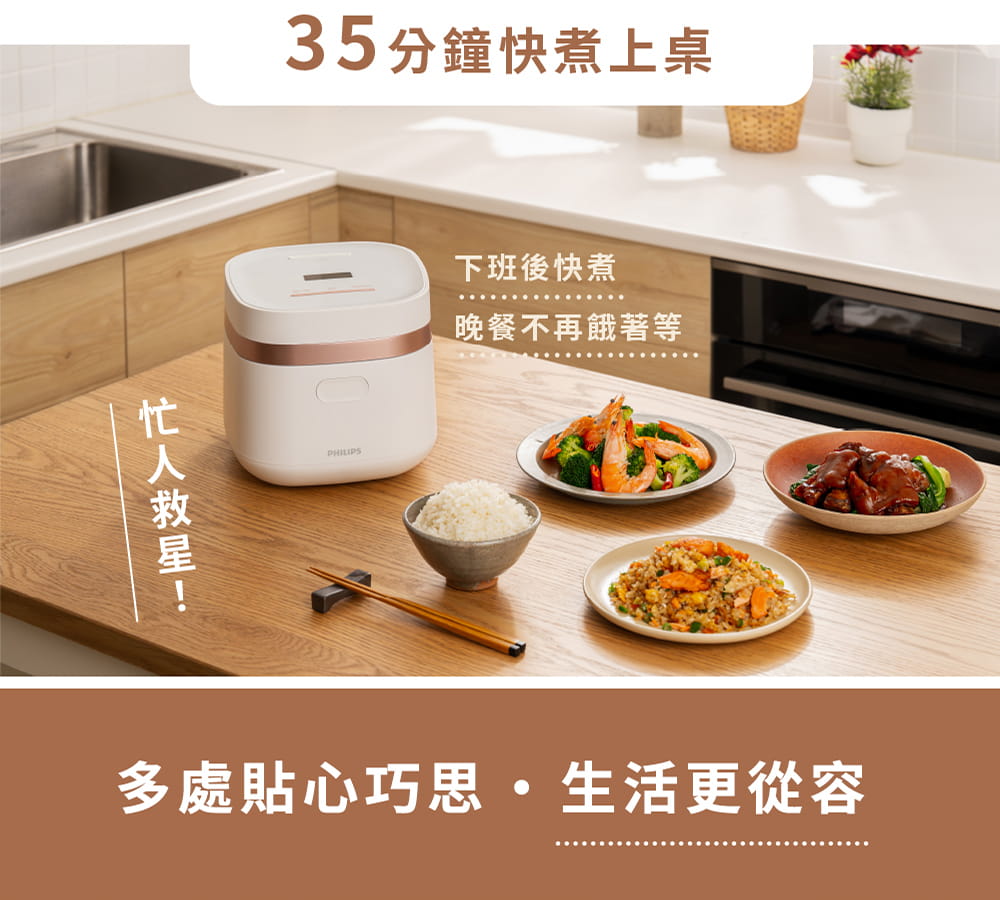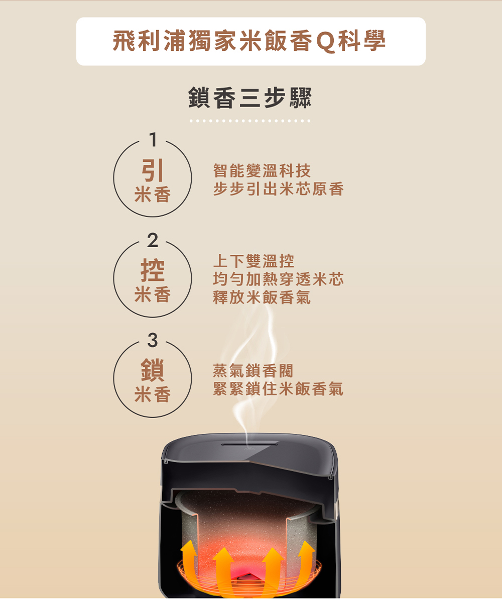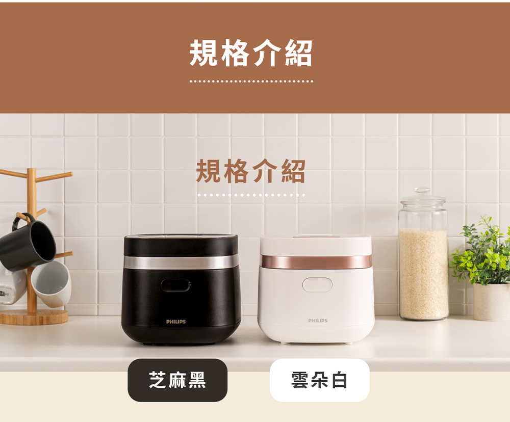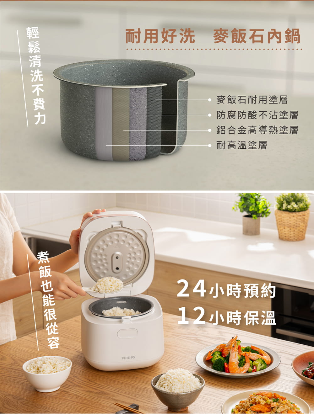 ★ 輕煮飯鍋首選–飛利浦小香鍋每一口米飯都Q彈噴香,一鍋多料理隨心烹飪享美味 香氣是餐桌美味加乘的關鍵,不容錯過飛利浦小香鍋HD3073,擁有智能變溫科技與蒸氣鎖香閥,徹底鎖住米香,讓每顆米飯更加Q彈飽滿,一開鍋就香氣撲鼻。精緻小尺寸,1人輕鬆煮,四人小家庭也可滿足。共有8種烹調模式,白飯烹香,還可滿足各種料理需求,料理小白也能輕鬆上菜。★ 獨家米飯香Q秘密!米飯烹香三步驟!不只Q彈 開鍋噴香 • 引香 :智能變溫科技,精控時間溫度引出米芯原香 • 控香:上下精準控溫,均勻加熱穿透米芯,釋放米飯香氣 • 鎖香: 獨家蒸氣鎖香閥,徹底鎖住米香不溢漏★ 小巧機身 大美味享受 小宅輕鬆煮,8大烹飪模式一鍋完成小香鍋精緻1.8L容量滿足3人份,專為小宅族、小家庭設計,1人份也可以輕鬆煮。內建8種烹飪模式,每天變換菜色也不膩口。透過人性化面板簡單操作,包含炊飯、煮粥、煲湯、蛋糕、蒸煮等,都能吃出美味幸福感。★ 美味如期 從容享受生活觸控美型介面好操作,麥飯石內鍋耐用好清洗,可拆式配件,清潔更無死角! 還可預約24小時自動料理、 12小時自動保溫,美味隨時享用,煮飯也能很從容。商品規格品牌 PHILIPS 飛利浦類型 電子鍋型號 HD3073顏色 雲朵白(HD3073/50)產地 中國商品尺寸(材積) 258x221x197mm電壓 110V頻率 60Hz產品重量 2.4 kg容量 4人份內鍋材質 不粘塗層合金配件 麥飯石內鍋、飯勺、量杯、電源線消耗功率 300~400W保固 2年BSMI許可字號 R3D904