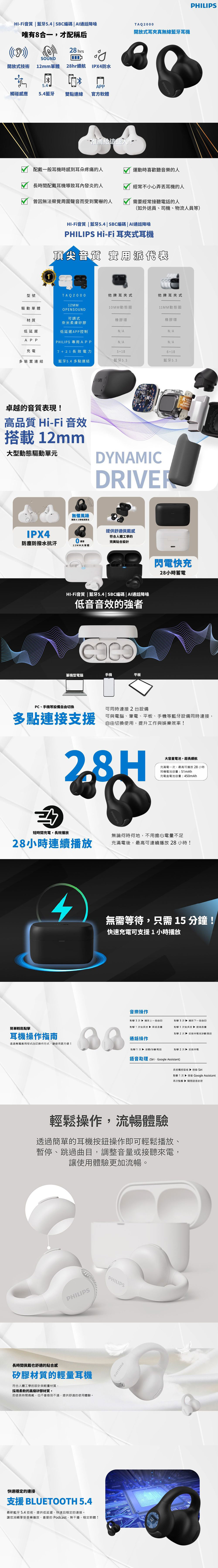 PHILIPS TAQ2000 是一款 耳夾式真無線藍牙耳機,專為運動、通勤與長時間配戴設計。搭載 12mm動態驅動單元,提供高品質 Hi-Fi 音效。