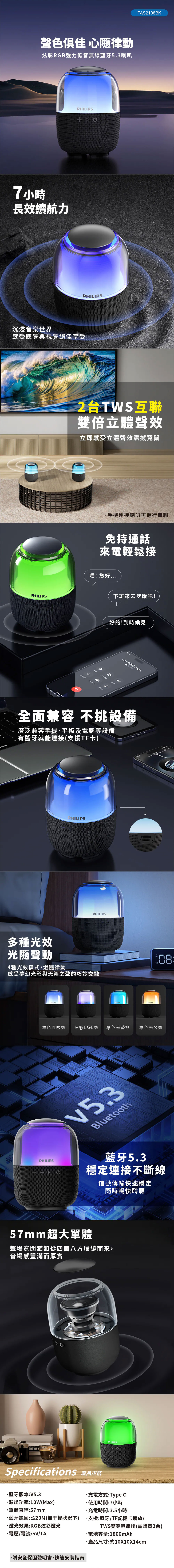 A2:這款藍牙音箱搭載飛利浦專業音效技術,低音渾厚、高音清晰,能呈現均衡音場,無論聽音樂、Podcast 或追劇,都有良好體驗。