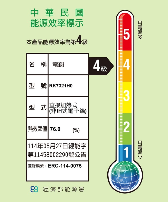 ◆型號:RK7321H0◆容量:10人份◆電壓頻率:110V/60Hz◆瓦數:750W◆產品尺寸: 長35.5 x 寬27.5 x 高24.5cm◆商品重量:3.5 kg◆產品配件:電子鍋、熱旋球釜內鍋、飯勺、湯勺、量杯、蒸籃、電源線◆能源效率分級:4級◆商檢字號:R31663◆商檢字號到期日:117/07/28◆保固:正常使用下保固1年,上網登錄再延長1年◆國際條碼:3045387254087◆產地:中國