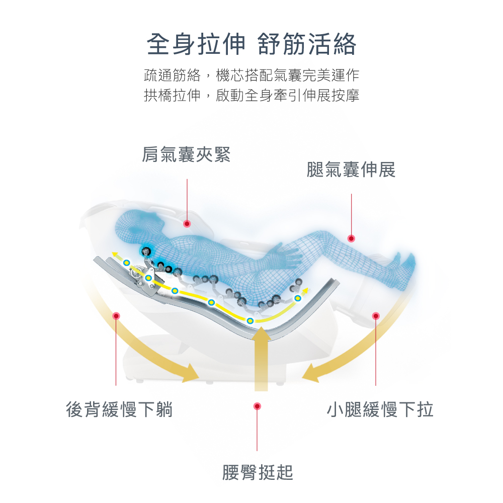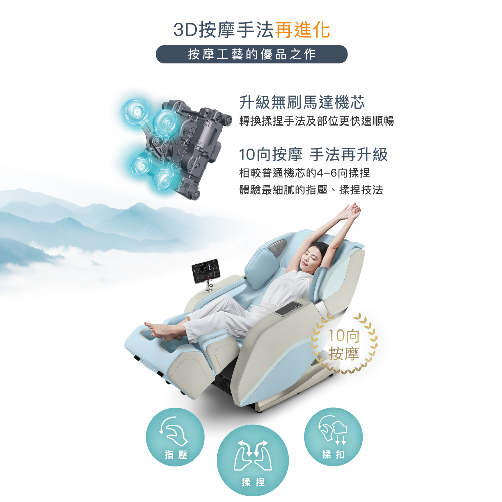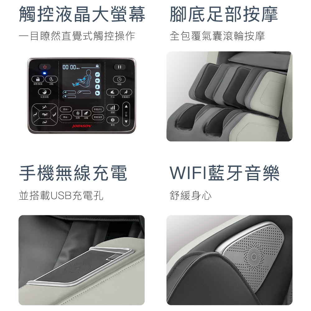 .無刷馬達機芯,按摩工藝的優品之作 可急速換向,速度更快,揉捏速度變化更大.升級10向按摩手法 3D機芯揉捏,揉捏、揉扣、指壓手法,實現最細膩的3D專業按摩.WSL人體工學導軌,開合126°,長度140cm 在頸椎和腰椎調整了向上的弧度,準確地貼合背脊曲線,承托您的身體.全身拉伸 舒筋活絡 拱橋拉伸,啟動全身牽引伸展按摩.自然放鬆 零重力 模擬NASA 126° 零重力仰角,全身受力均勻,減少脊椎與關節壓力.內建12組情境按摩程式 快速放鬆、白領一族、酸痛舒緩、瑜珈開背、調和養生等數種按摩程式.腰部溫熱 舒適溫熱 ,緩解一天疲勞感, 助您放鬆入眠.足部腳底按摩 全包覆氣囊搭配滾輪按摩,解放足部壓力.搭載液晶大螢幕 直覺式觸控操作,讓您輕鬆操作使用.便利設計 無線充電板及USB充電插孔,搭載WIFI藍牙