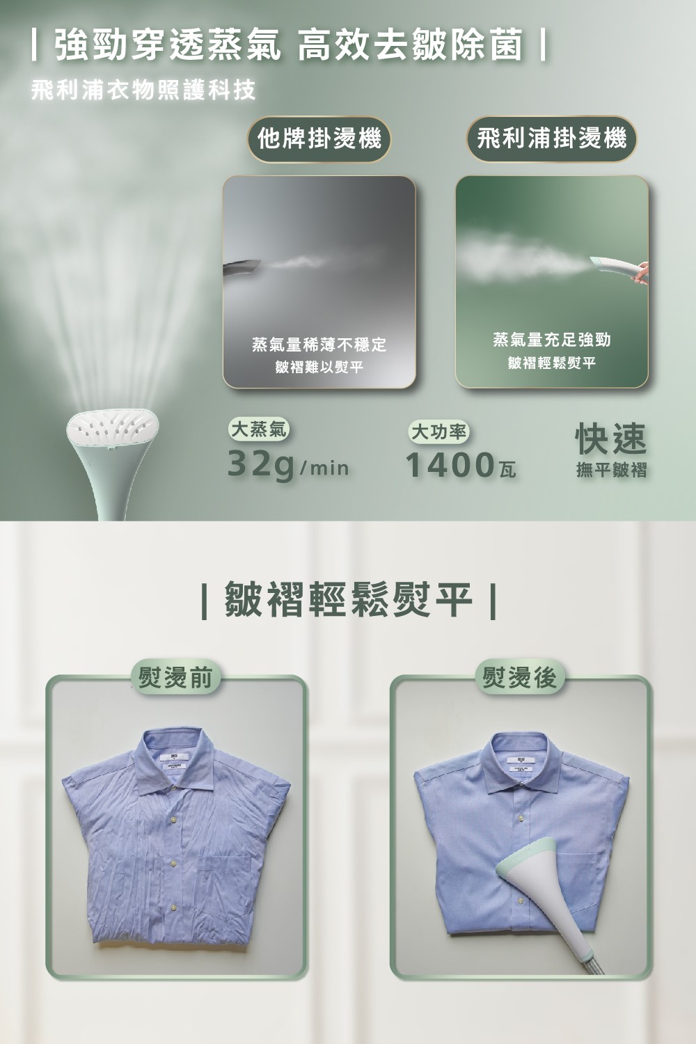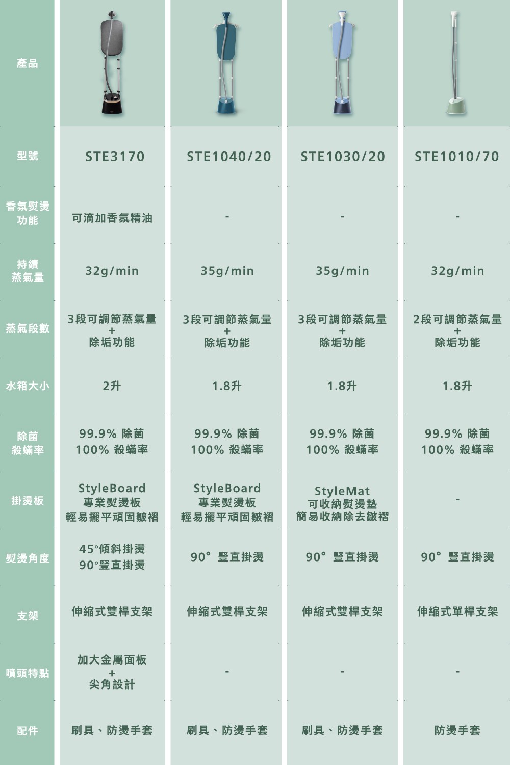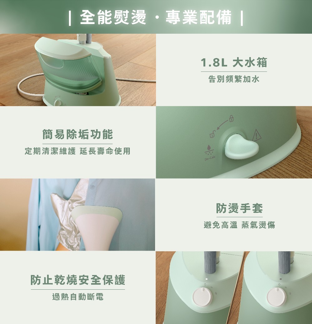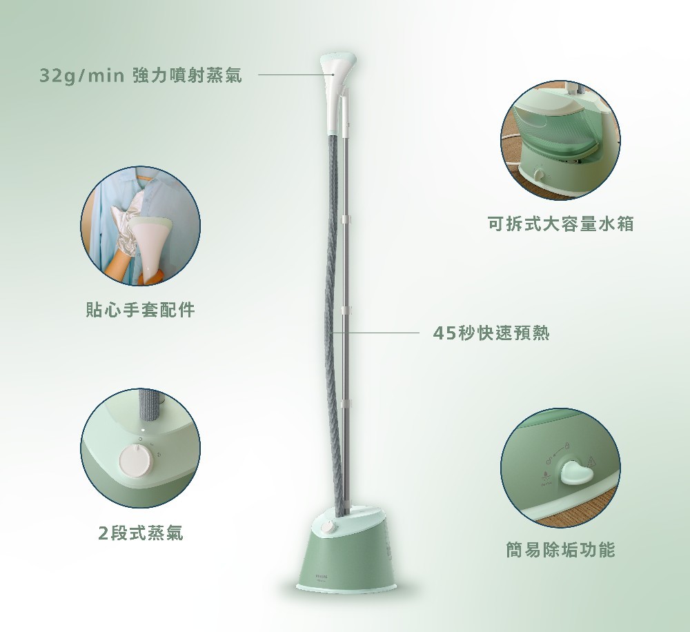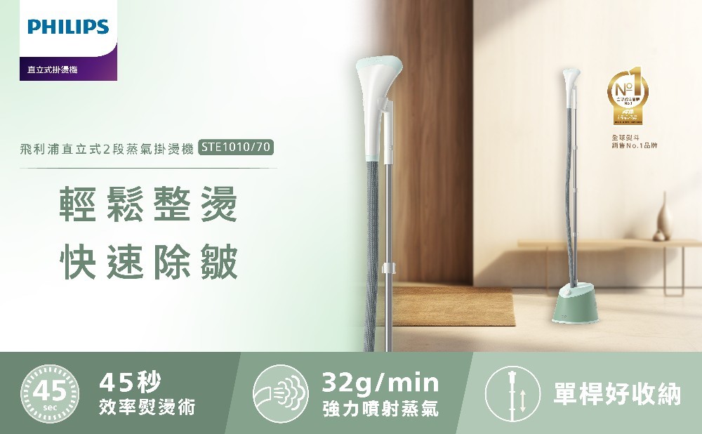 商品特色 可調節式單桿 輕巧好收納連續蒸氣輸出 32 g/min45秒效率熨燙數2段式強力蒸氣 1.8 公升可拆式水箱商品賣點✦ 專業熨燙極致除皺!飛利浦全能熨燙專家45秒效率熨燙,從容迎接每一天 忙碌的早晨,衣服皺巴巴來不及熨燙?使用飛利浦直立式3段蒸氣掛燙機STE1010,只需45秒效率熨燙,結合每分鐘32g強力蒸氣X3段蒸氣模式,能迅速撫平頑強皺摺,讓您的衣物煥然一新,輕鬆完美出門!★ 強力熨燙蒸氣快速撫平皺摺飛利浦 STE1010 每分鐘釋放 32g 均勻且強勁的蒸氣,深層穿透衣料,快速撫平頑固皺褶,讓衣物輕鬆恢復平整。★ 細緻蒸氣呵護各種衣物3段式蒸氣模式,細緻蒸氣均勻受熱不挑衣料,無論是絲綢、羊毛、厚重大衣都能安心熨燙,給衣物最極致呵護。★ 快速除菌殺蟎,讓衣物清新無異味熨燙衣服同時輕鬆除菌和殺蟎,高溫蒸氣強力穿透,實驗證實1分鐘可殺死99.9%細菌,讓衣物保持清新乾淨,保障您的健康。★ 全能專業裝備,熨燙無死角伸縮單桿支架,方便懸掛衣物,熨燙更穩固1.8 大公升可拆式水箱,加水清潔都方便貼心防燙手套,整燙衣物更安心簡易除垢功能,產品的使用壽命更長久 商品規格 品牌:PHILIPS飛利浦 型號:飛利浦直立式蒸氣掛燙機 STE1010產地:中國類型:直立式電壓:110V彩盒尺寸:35 x 34.7 x 42.7 cm (L x W x H cm) 蒸氣率 (最大):32 g/min 蒸氣設定:2種蒸氣設定 功率:1600W 水箱容量:1.8 L 蒸氣軟管:(安全健康)矽膠加熱時間:45秒保固:2年保固BSMI許可字號:R3D904備註1 上述規格如有錯誤,請以原廠公告為主備註2 為確保本商品功能完善,於出廠時均經過檢測程序,若您發現水箱殘留些許水(氣)屬正常現象,不影響產品功能與保固服務備註3 使用產品前,請先詳閱使用手冊