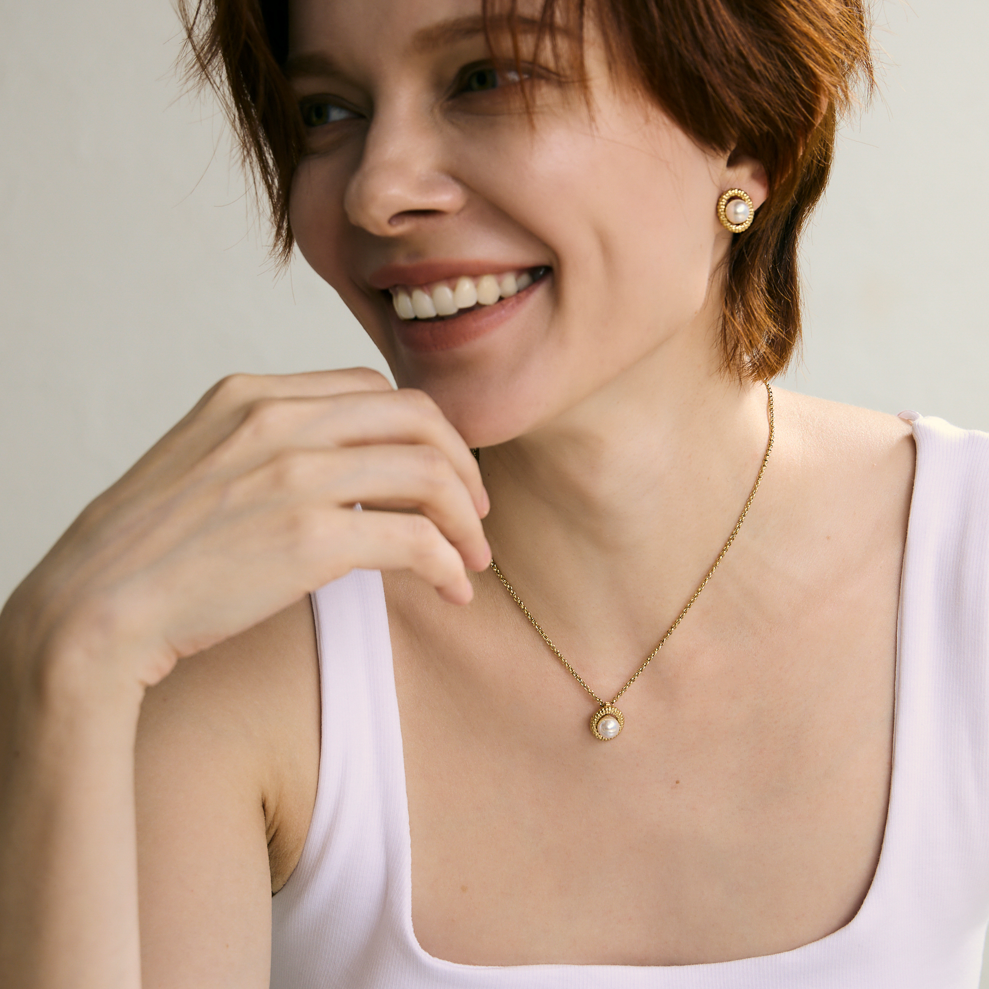 內圈嵌上永續E珍珠,單墜垂掛,讓莓果圈環和珍珠潤光相互映照,呈現具有古典氛圍與精緻層次的質感單品。