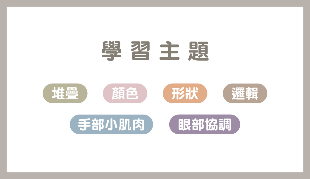 附有手把的收納圓筒,方便攜帶●學習主題:眼部協調/手部小肌肉/形狀/顏色/堆疊/邏輯