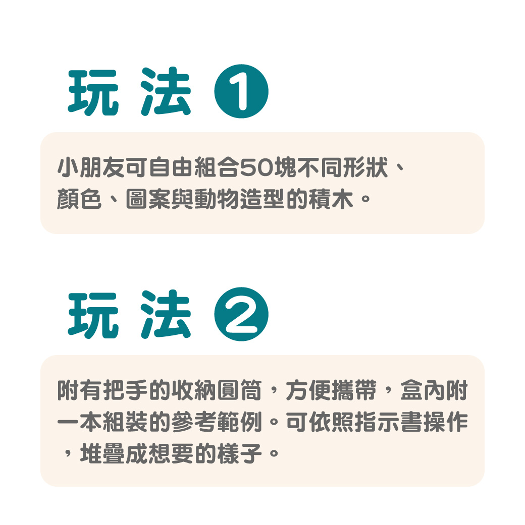 在這裡,有可愛的小動物、繽紛的積木,等著孩子盡情發揮想像力●積木含50塊不同形狀、顏色、圖案與動物造型,自由堆疊專屬派對場景●堆疊過程中,孩子不僅培養手眼協調、精細動作,