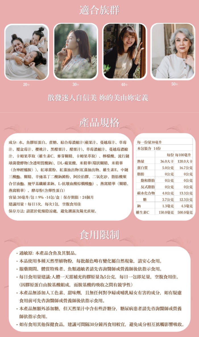成分:水、魚膠原蛋白、蔗糖、綜合莓濃縮汁(蘋果汁、蔓越莓汁、草莓 汁、覆盆莓汁、櫻桃汁、黑醋栗汁、醋栗汁)、草莓濃縮汁、蔓越莓濃縮 汁、卡姆果萃取(維生素C、麥芽糊精、卡姆果萃取)、檸檬酸、流行鏈 球菌發酵物(含透明質酸鈉)、DL-蘋果酸、米精華(環狀糊精、米精華 (含神經醯胺))、紅球薑粉、紅藻抽出物(紅藻抽出物、維生素E、中鏈 三酸酯、糊精、辛烯基丁二酸鈉澱粉、阿拉伯膠、二氧化矽、脂肪酸聚 合甘油酯、羧甲基纖維素鈉、L-抗壞血酸棕櫚酸酯)、燕窩精華(糊精、 燕窩精華)、酵母粉(含彈性蛋白)
