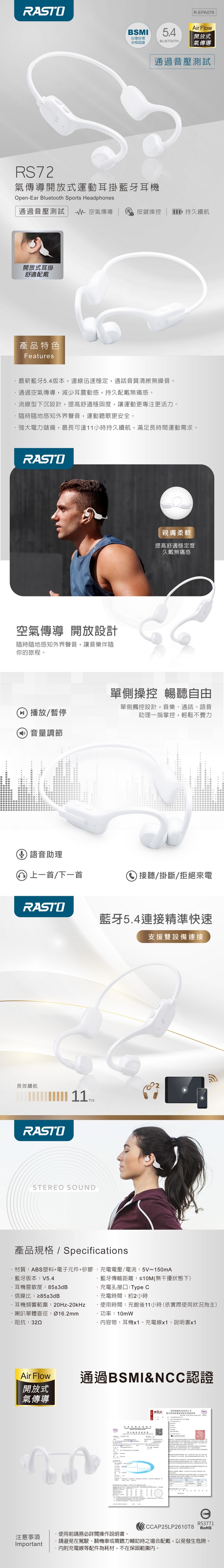 .BSMI證號:R53771.NCC:CCAP25LP2610T8.藍牙5.4版本,連線迅速穩定,通話音質清晰無噪音.運動時可同時聆聽音樂與外界聲音,安全不受限.通過空氣傳導,減少耳震動感,持久配戴無痛感.聲音清晰飽滿,通話音質穩定無干擾.長效續航,充飽電可使用約 11 小時.一鍵操作輕鬆掌握,運動中也能快速切換,不影響節奏.無論通勤、運動或休閒,都能享受細膩音色