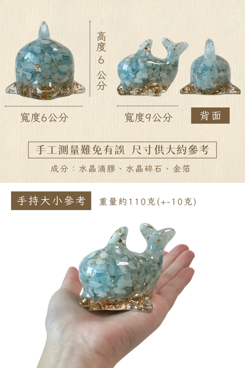 ◿ 商品內容:水晶海豚1隻◿ 成分:水晶滴膠、天然晶石◿ 尺寸:(手工測量會有些許誤差)✦ 整體高度 6 CM✦ 正面寬度 6 CM✦ 側面寬度 9 CM◿ 重量:約110克(誤差值+-10克)