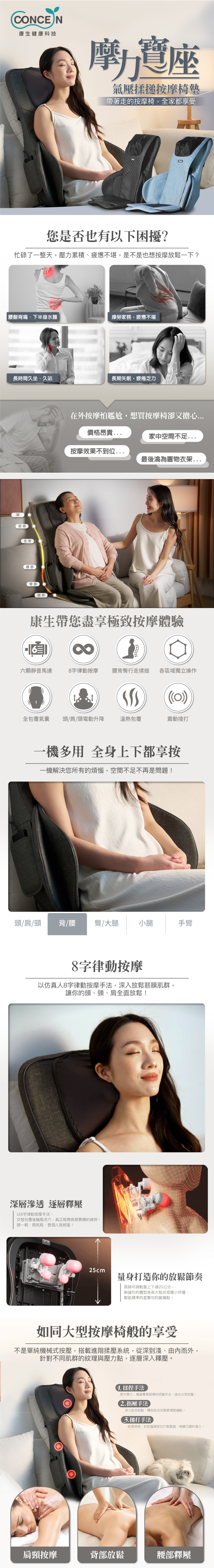 產品型號: CON-2618產品尺寸: 81x56x48.5 cm額定電壓: DC 12V產品重量: 8.5 kg額定電流: 5A產品材質: 貓抓皮布套、透氣網布額定功率: 60W產地: 中國額定時間: 15分鐘產品配件: 按摩椅墊、變壓器、車用電源線、說明書x1(含保固卡)