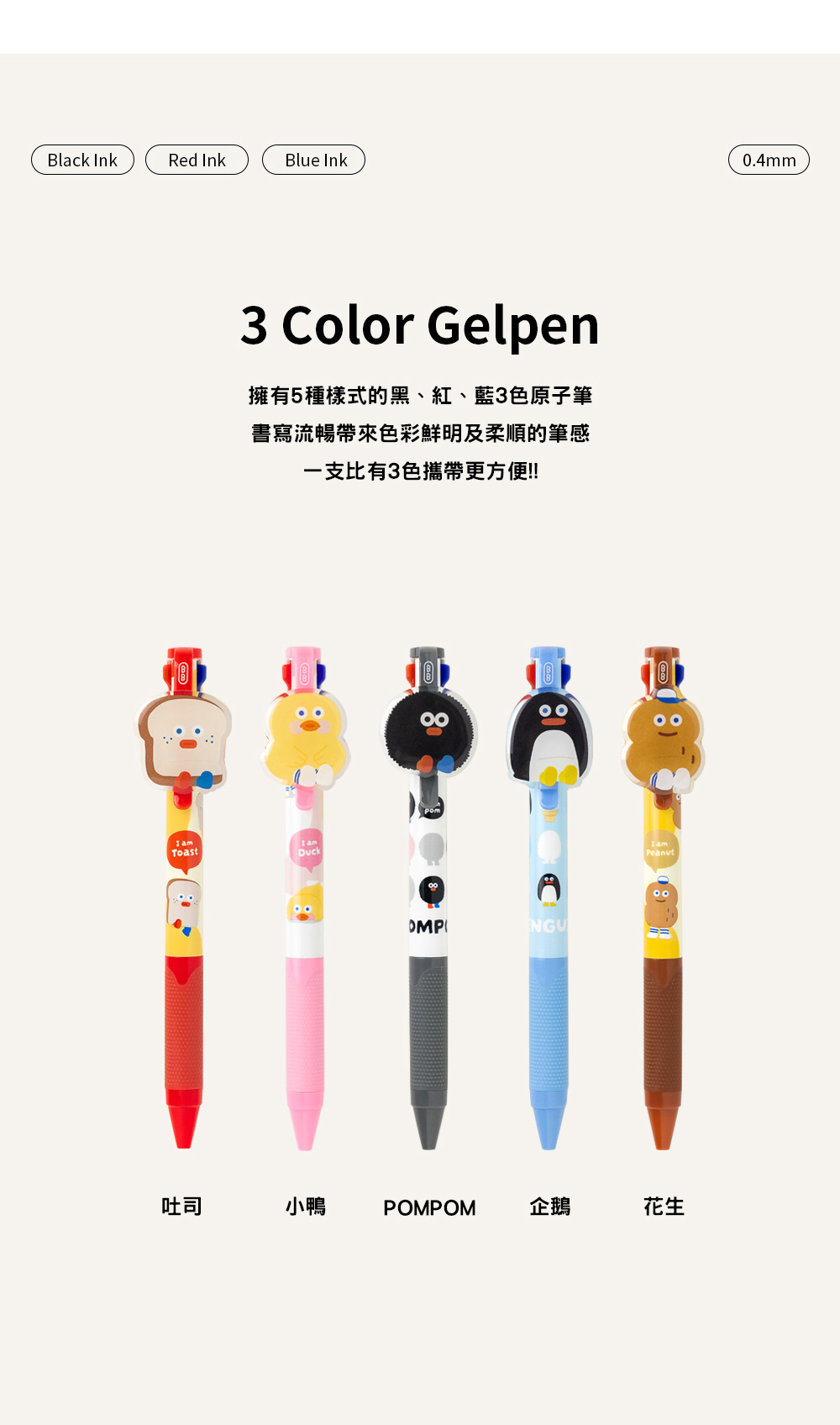 擁有5種款示,黑、紅、藍3色的果凍筆