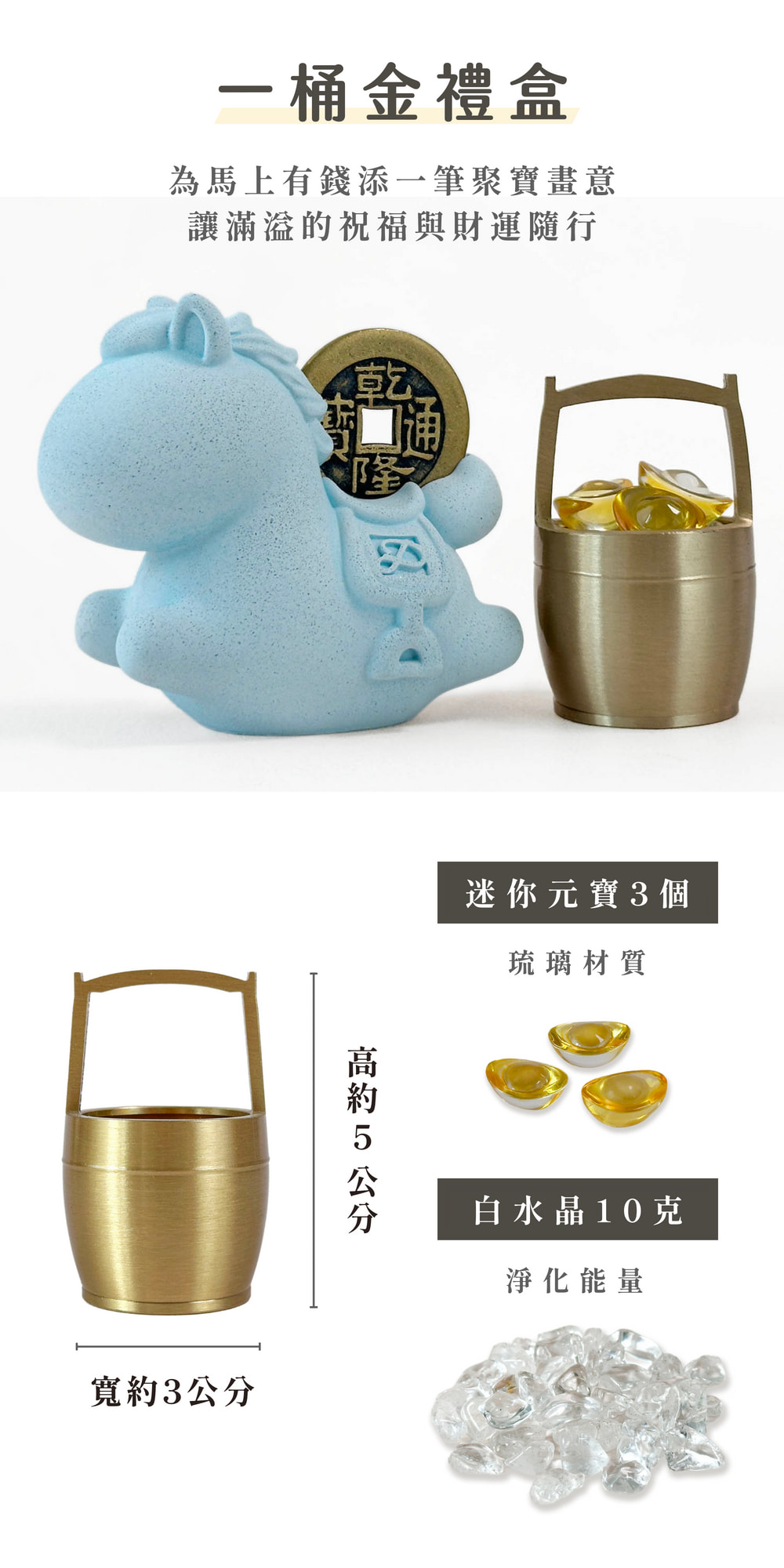 ▾ 一桶金 ▾ ◿ 材質:黃銅◿ 尺寸:高度5cm、寬度3cm⚠ 附白水晶碎石+琉璃元寶3顆