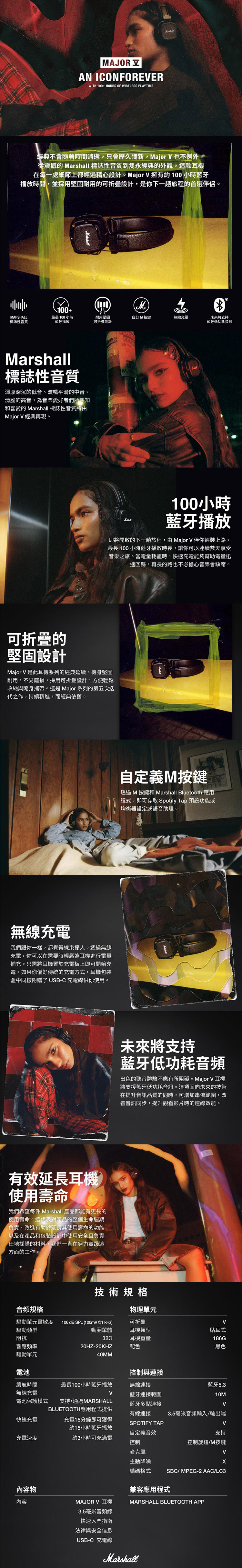 經典不會隨著時間消逝,只會歷久彌新,MAJOR V 也不例外。從震撼的MARSHALL 標誌性音質到雋永經典的外觀,這款耳機在每個細節上都經過精心設計。MAJOR V 擁有約100小時藍牙播放時間,並採用堅固耐用的可折疊設計,是你下一趟旅程的首選伴侶。MAJOR V 支援一系列全新功能,每個聆聽時刻都值得信賴。使用機身上的M按鍵可直接存取SPOTIFY TAP,或使用MARSHALL BLUETOOTH應用程序,重設為均衡器預設或喚起語音助手,一切掌控均在指尖。內建麥克風新升級,可更好地降低風噪以提升通話品質。耳罩式無線藍牙耳機,約100小時續航力。