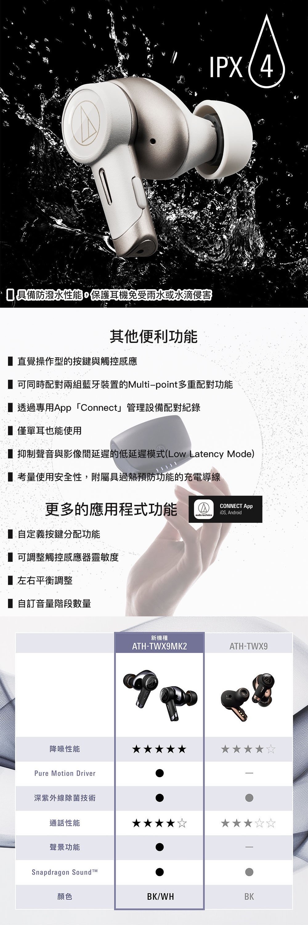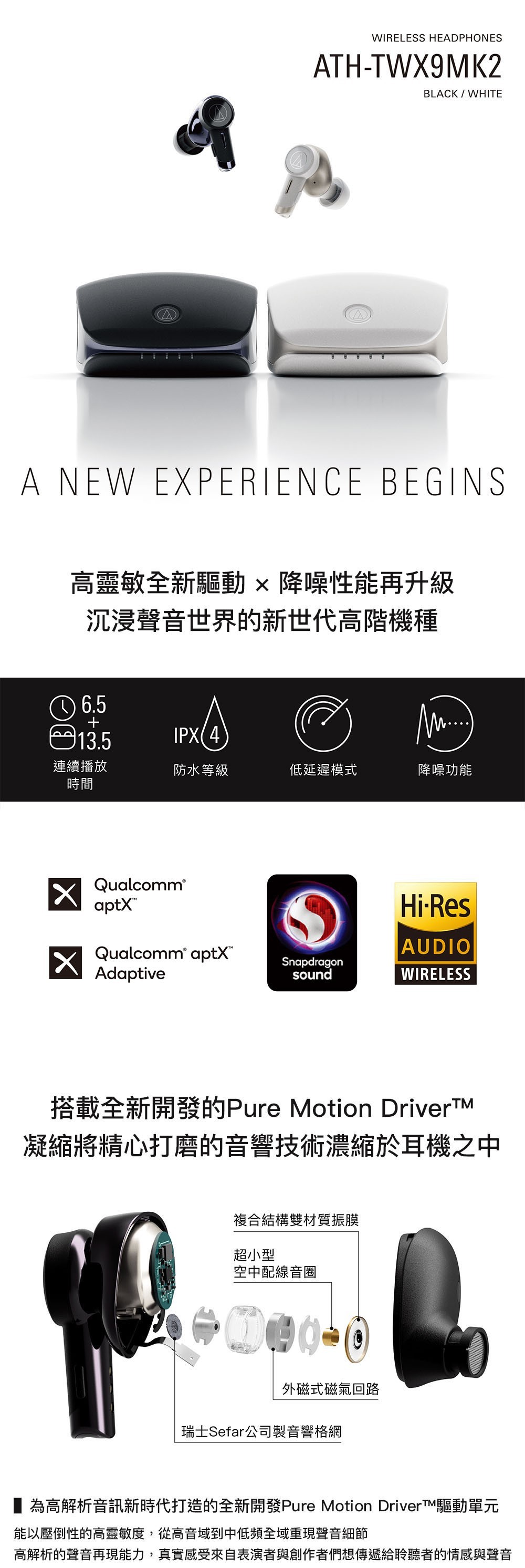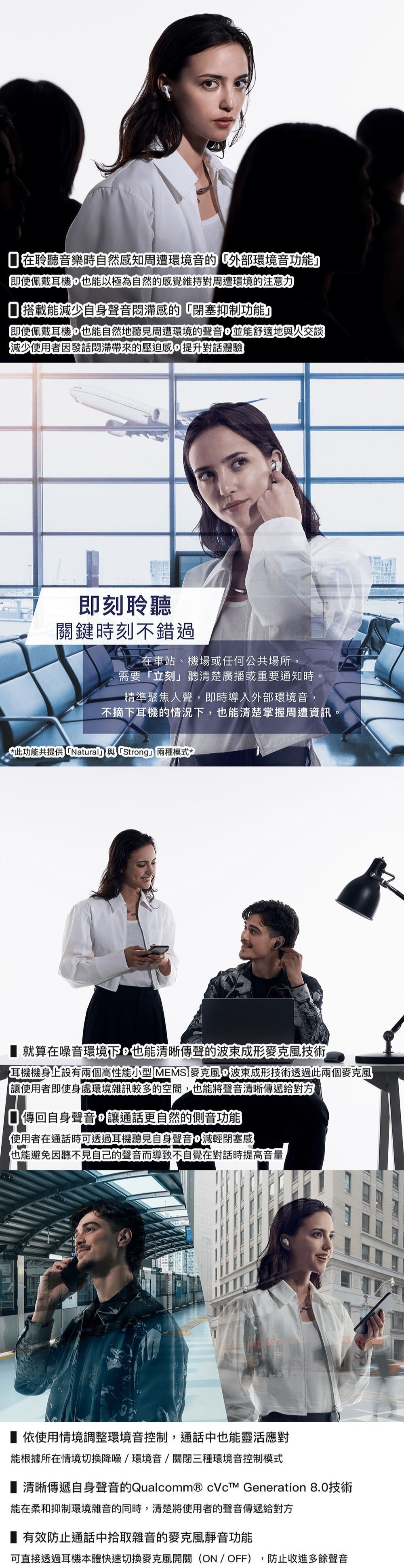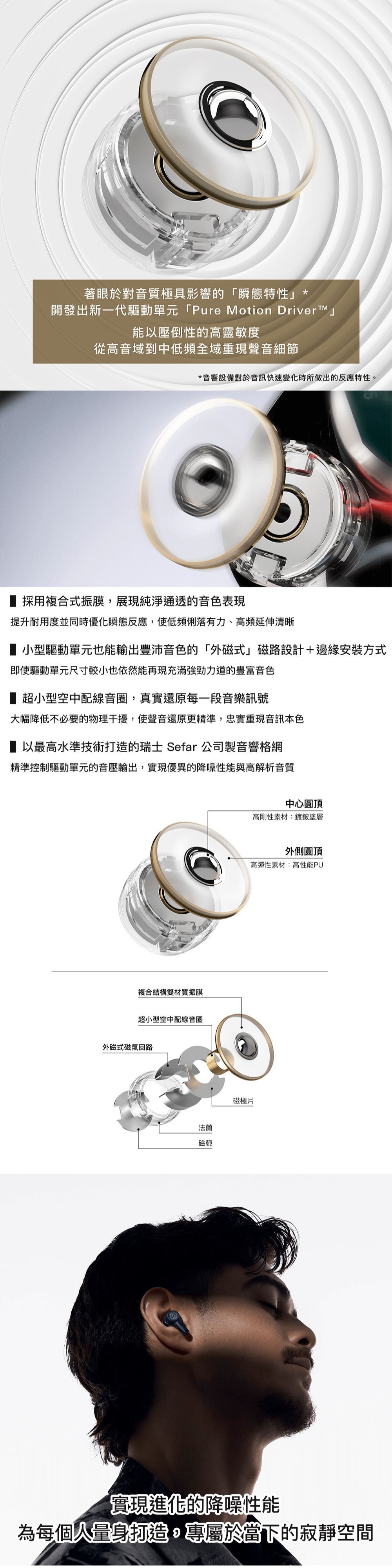 為高解析音訊新時代量身打造的全新開發Pure Motion Driver™驅動單元採用複合式振膜,展現純淨通透的音色表現小型驅動單元也能輸出豐沛音色的「外磁式」磁路設計+邊緣安裝方式超小型空中配線音圈,真實還原每一段音樂訊號全新進化的複合式數位主動降噪技術多色LED顯示,電量與狀態一目了然最長可連續播放約6小時具備防潑水性能,保護耳機免受雨水或水滴侵害可同時配對兩組藍牙裝置的Multi-point多重配對功能