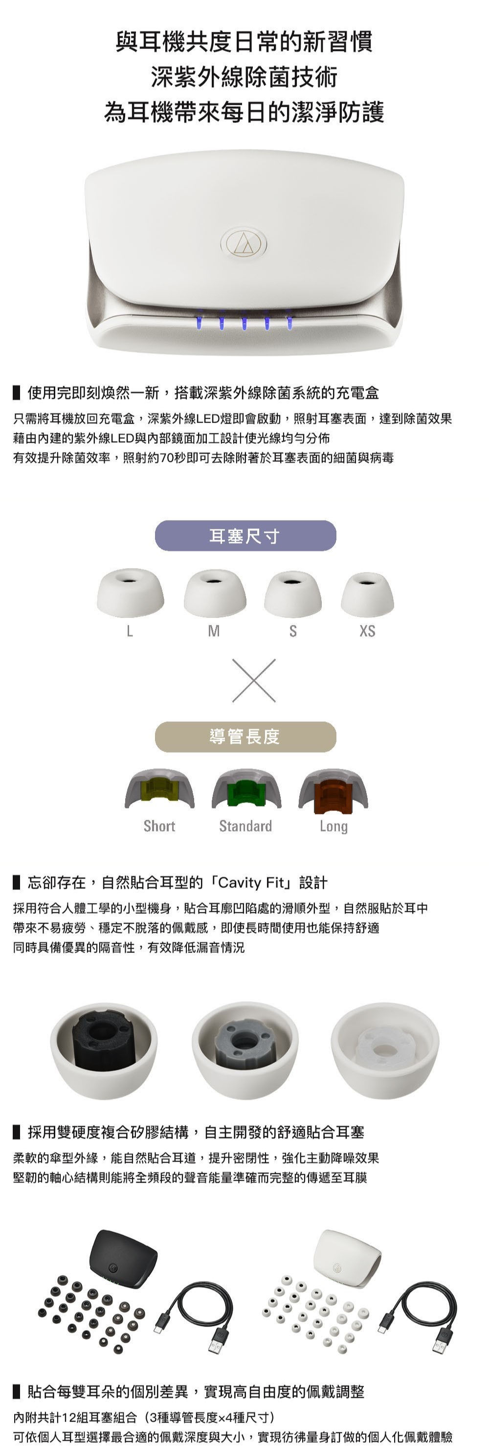 型式:動圈型驅動單元:Ø5.8mm輸出感度:105dB/mW頻率響應:10~40,000Hz輸入阻抗:16Ω電源型式:耳機:DC 3.85V鋰離子電池;充電盒:DC 3.85V鋰離子電池充電時間:耳機:約2.5小時;充電盒:約3.5小時(USB充電),約5.0小時(無線充電)(依據使用條件而異)電池續航力:連續播放時間(音樂播放,降噪功能開啟):耳機最高約6.0小時,搭配充電盒時最高約18.5小時;連續播放時間(音樂播放,降噪功能關閉):耳機最高約6.5小時,搭配充電盒時最高約20小時(依據使用條件而異)工作溫度範圍:5°C~40°C通話麥克風型式:MEMS型通話麥克風指向特性:全指向性通話麥克風感度:-38dB(1V/Pa,at 1kHz)通話麥克風頻率響應:20~10,000Hz防塵防水等級:IPX4(僅限耳機本體)重量:左側耳機:約5.5g;右側耳機:約5.5g;充電盒:約56.7g附屬品:USB充電線(50cm,USB Type-A/USB Type-C),耳塞:短(XS、S、M、 L)、標準(XS、S、M、L)、長(XS、S、M、L)通訊方式:Bluetooth標準規格Ver.5.2通訊使用頻段:2.402GHz~2.480GHz通訊距離:視線良好範圍約10m以內調變方式:GFSK、Pi/4DQPSK、8DPSK支援Bluetooth協定:A2DP、AVRCP、HFP支援編碼:Qualcomm®aptX™Adaptive音訊、Qualcomm®aptX™音訊、AAC、SBC支援內容保護:SCMS-T支援取樣頻率:44.1kHz、48kHz、96kHz(使用Qualcomm® Snapdragon Sound時)傳輸頻率範圍:10Hz~47,000Hz(當Qualcomm® Snapdragon Sound 96kHz取樣時)、20Hz~20,000HzRF射頻輸出功率:10mW EIRPNCC 型式認證號碼:CCAH23LPA831T1