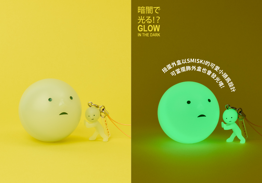 扭蛋外盒以SMISKI的經典表情為設計,平底設計可以固定在桌面不隨意移動就好像SMISKI偷偷抬頭看著你一樣,成為額外的有趣擺飾更令人驚喜的是,不管是SMISKI、隨附的吊飾掛繩、或是SMISKI造型的扭蛋外殼全部都以夜光材質製作,可以在黑暗中發光喔!