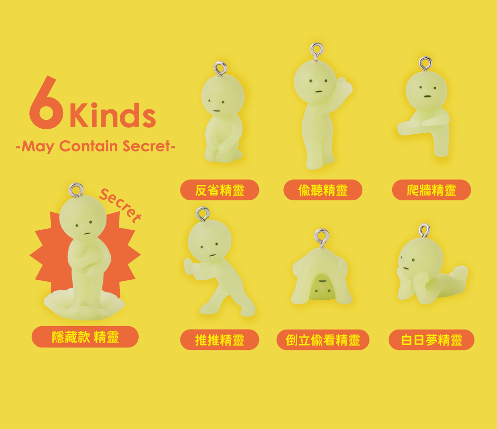全新推出的神秘扭蛋吊飾公仔-第二彈,以SMISKI經典系列的第二彈為主題完美重現他們無法理解、又有點逗趣的動作:爬牆精靈、偷聽精靈、白日夢精靈、倒立偷看精靈、反省精靈、推推精靈…這些不可思議的夜光精靈,將以吊飾的方式進入我們的生活!