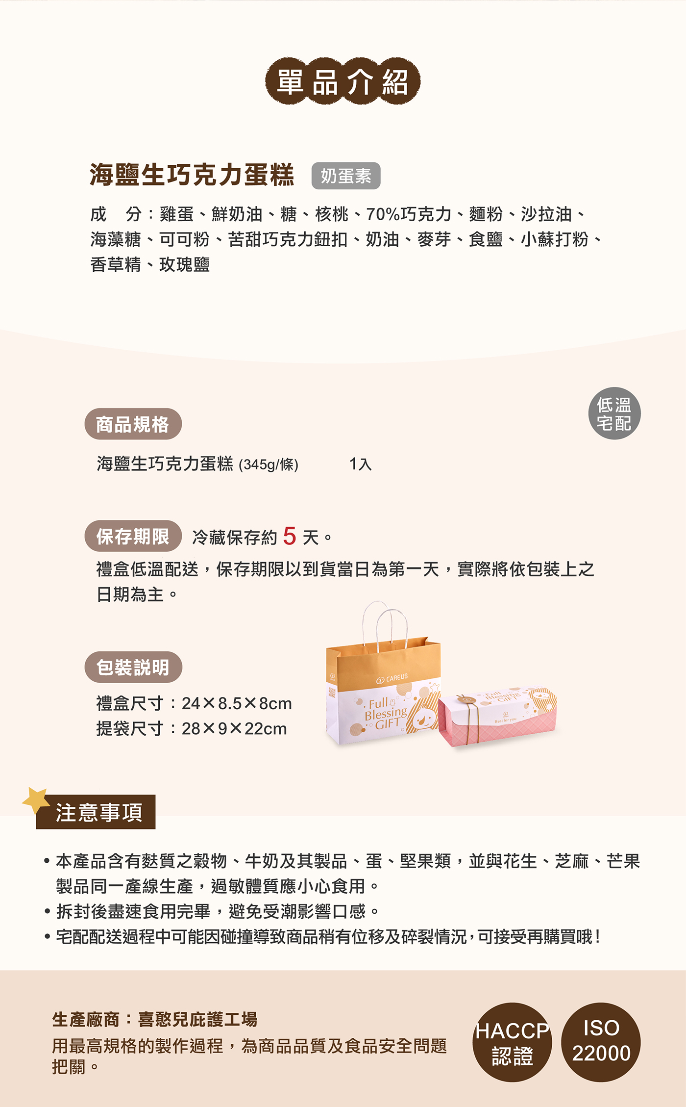✦內容物:海鹽生巧克力蛋糕一入
