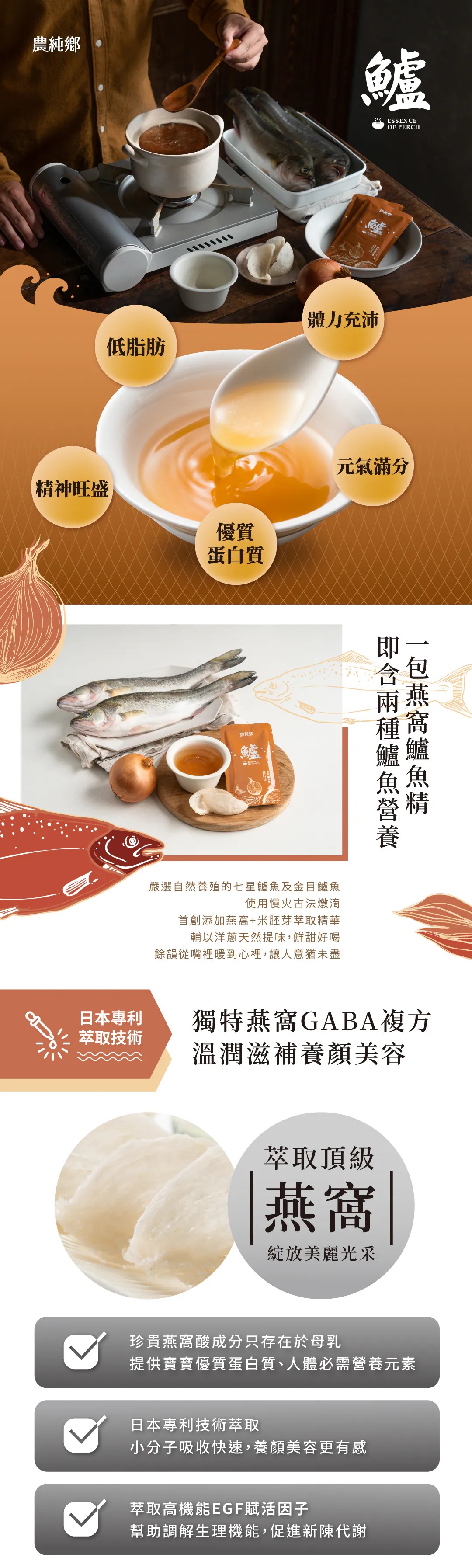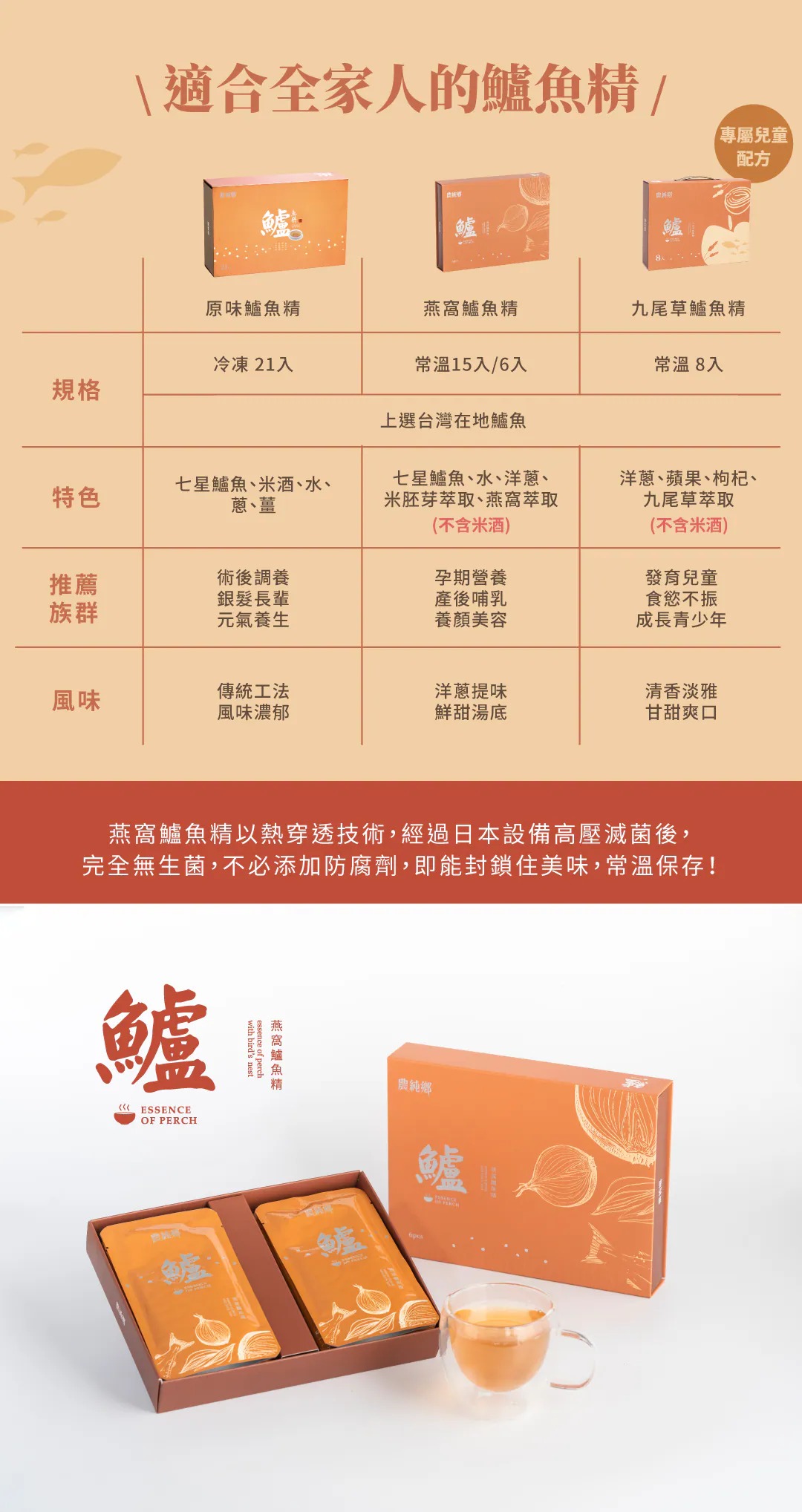 一包即兩種鱸魚精華額外添加GABA與燕窩萃取 (無米酒)優質蛋白質與膠質補充元氣 恢復體力適合病後、術後之病人及產後媽咪好喝像現煮日式湯頭新鮮滴煉,可常溫保存2年(新舊包裝轉換中,以實際收到商品為主)