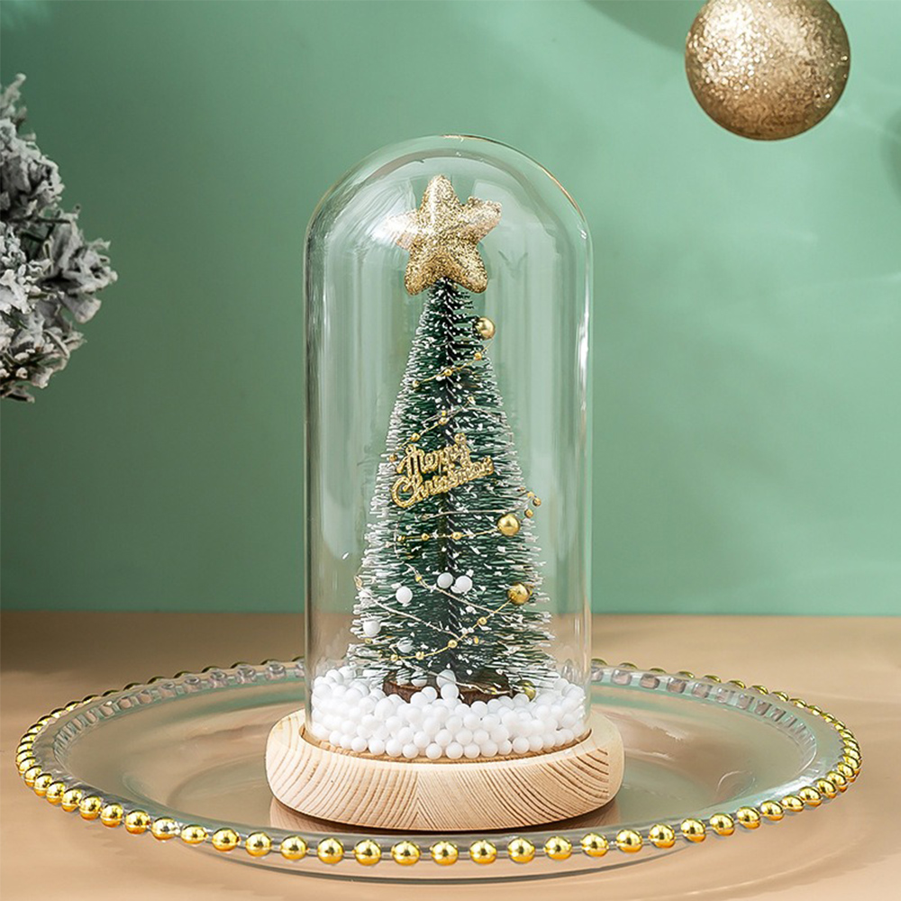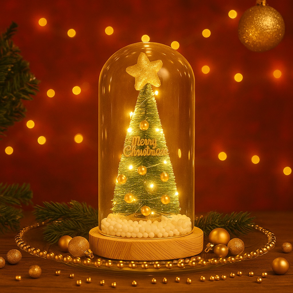 ⭐ 金色星星閃爍於聖誕樹頂,玻璃罩裡散發著溫暖光影。