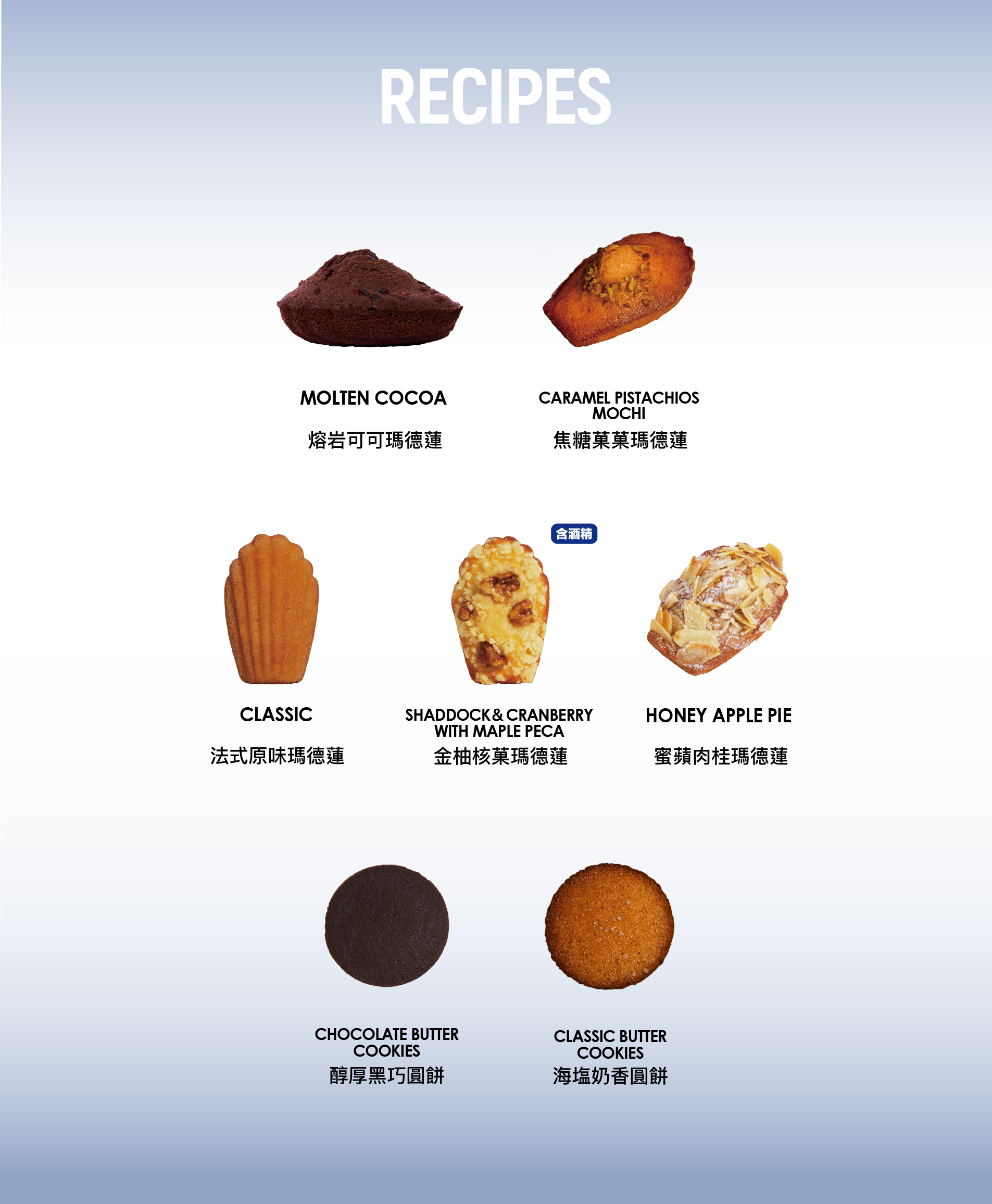 法國無鹽發酵奶油、日本愛心麵粉、牧場雞蛋、細砂糖、藍鑽杏仁粉、香草波本萃取物、蜂蜜、焦化奶油、奶粉、法國鹽之花、糖粉。