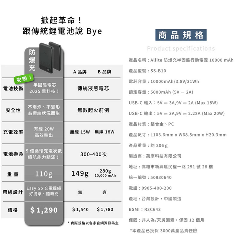 ✨ 來自航太科技,半固態技術降臨 ✨熬得住的超長壽命、耐得住的高溫穩定輸出✈️ 全球通行|5000 / 10000mAh,清楚標示 Wh 可帶上飛機|半固態電芯|不只穩定,更有 5 倍壽命|鋁合金外殼|抗摔 防碎 防刮|電路模組|過熱即降壓、過流即斷電