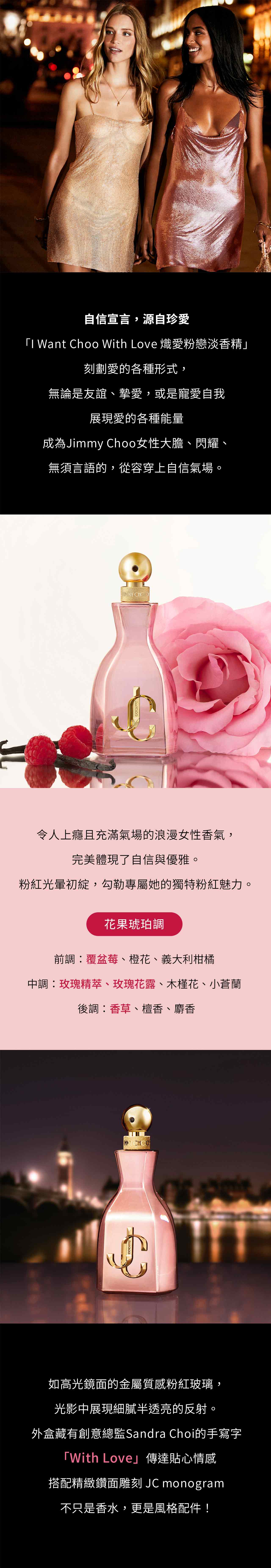Jimmy Choo 以舉世聞名的奢華美學與女性力量,再度為旗下最具代表性的「I Want Choo熾愛香氛系列」添上全新代表作 ─《I Want Choo With Love 熾愛粉戀淡香精》。全新香氛以「愛」為核心靈感,如閨蜜間的支持、任何情感中的相伴,或是自我珍愛的力量,都是表現出愛的不同層面,將愛的能量化作自信活力的粉色香氣,打造一款專為現代女性而生、充滿愉悅與高級感的全新香氛體驗。