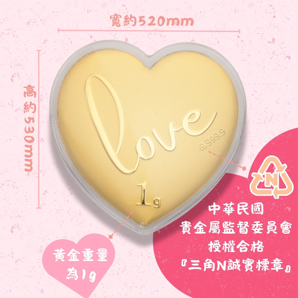 名稱:黃金9999純金 1克 1g金條 心動紀念 幸運星LuckyStar (一公克金塊 投資/收藏/保值)材質:純金金重:黃金約重1克尺寸:如實品(愛心尺寸約520mmx530mm不含壓克力)配件:包裝盒x1、保證卡x1、手提袋x1