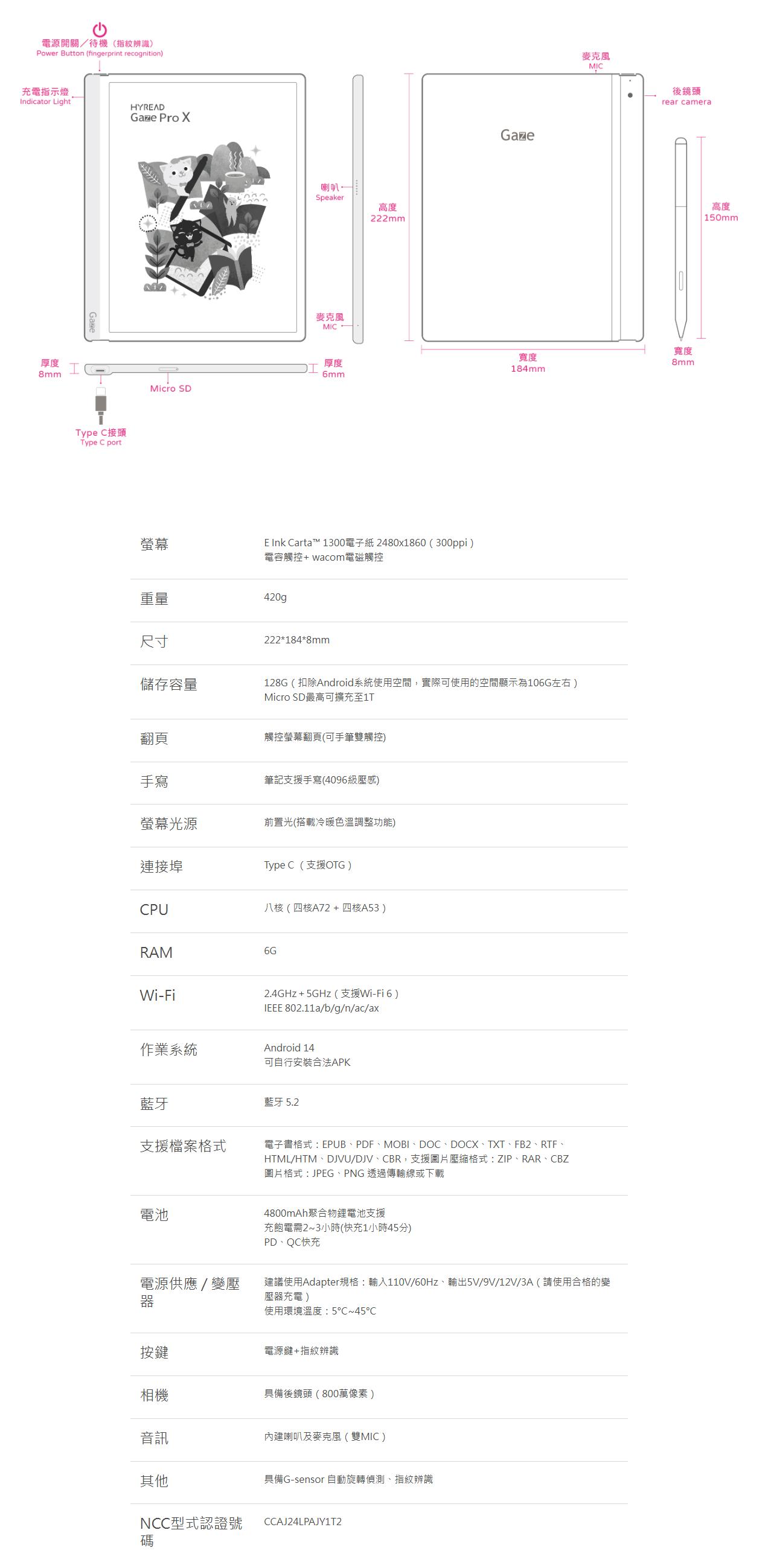 NCC型式認證號碼:CCAJ24LPAJY1T2螢幕特性: 電子紙閱讀器採E Ink電子紙顯示器,如紙般輕薄,由塑膠薄膜及薄玻璃製成,與生活中使用的LCD螢幕完全不同,無法承受外力撞擊、摔落、單點施壓、物品重壓等,皆可能造成螢幕損壞,請您使用上務必留意。