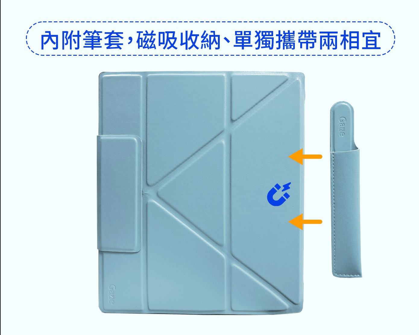 可拆式皮套設計,輕巧無負擔。內附筆套,磁吸收納、單獨攜帶兩相宜。磁吸感應,自動休眠與喚醒。直放橫看,隨變都OK。