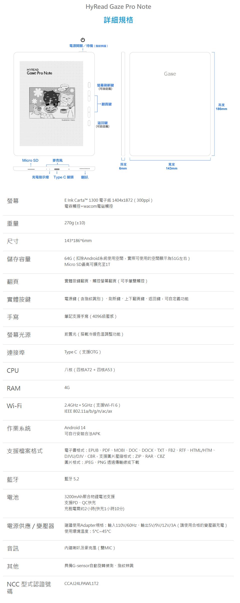 內含:Gaze Pro Note 閱讀器-1台(內附充電/傳輸線1條)NCC型式認證號碼:CCAJ24LPAWL1T2螢幕特性: 電子紙閱讀器採E Ink電子紙顯示器,如紙般輕薄,由塑膠薄膜及薄玻璃製成,與生活中使用的LCD螢幕完全不同,無法承受外力撞擊、摔落、單點施壓、物品重壓等,皆可能造成螢幕損壞,請使用上務必留意。
