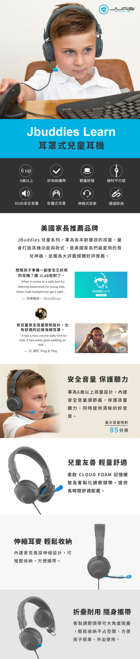 專為6歲以上孩童設計柔軟記憶襯墊,長時間舒適配戴安全音量調節器,不超過 85 分貝可伸縮式隱藏麥克風,方便收納可折疊式耳罩,外出隨身攜帶3.5mm音源線,隨插即用高強度線材,耐用不打結兼容平板、電腦、手機等播放器40mm驅動單體,白金級音質