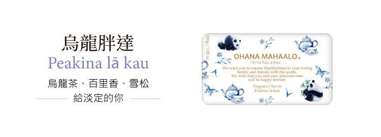 ◆商品內容OHANA MAHAALO 烏龍胖達 輕香水30mlx1OHANA MAHAALO 烏龍胖達 絲柔手工皂200gx1