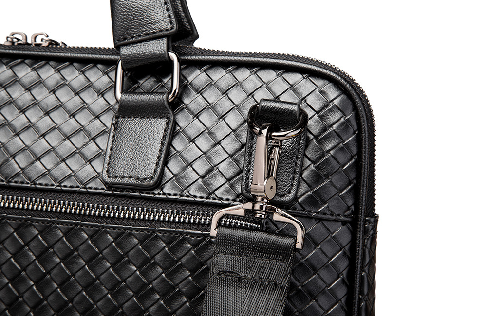 編織質感 商務手提包以低調黑色編織皮革展現紳士格調,俐落輪廓搭配雙提把設計,兼具挺度與容量。