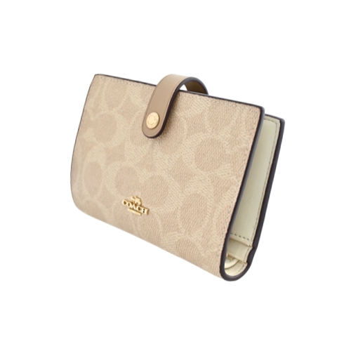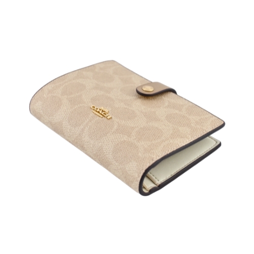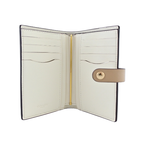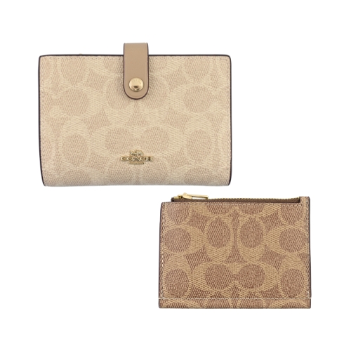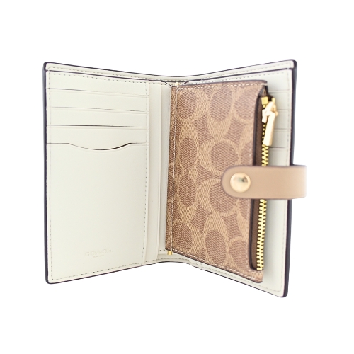 COACH中夾,採用經典C LOGO PVC,內部後設一可拆式拉鍊零錢袋,亦可拆卸單獨使用,裡層設置卡片夾層與鈔票層,收納齊全、好攜帶,適合長久使用。★尺寸:寬13CM高9CM側邊厚2.5CM ★規格:皮革釦式雙摺開合,內附8格卡夾/單層鈔票夾/4格直式萬用夾層,內部一可拆式拉鍊袋