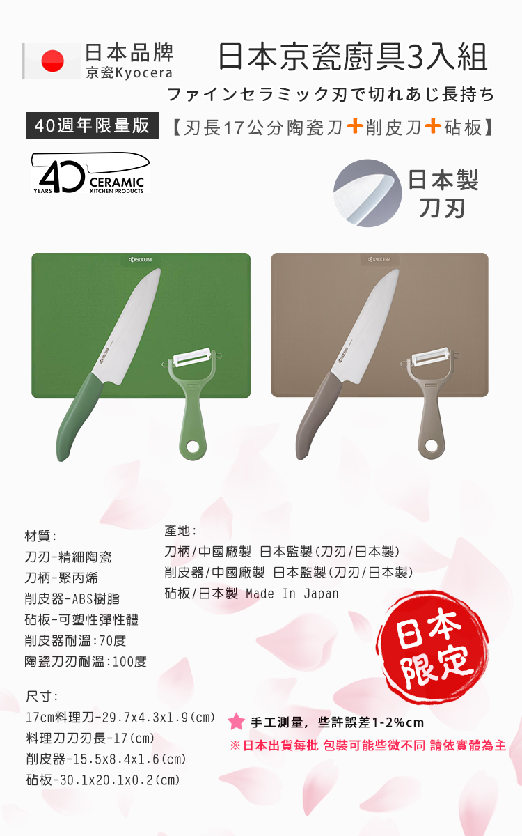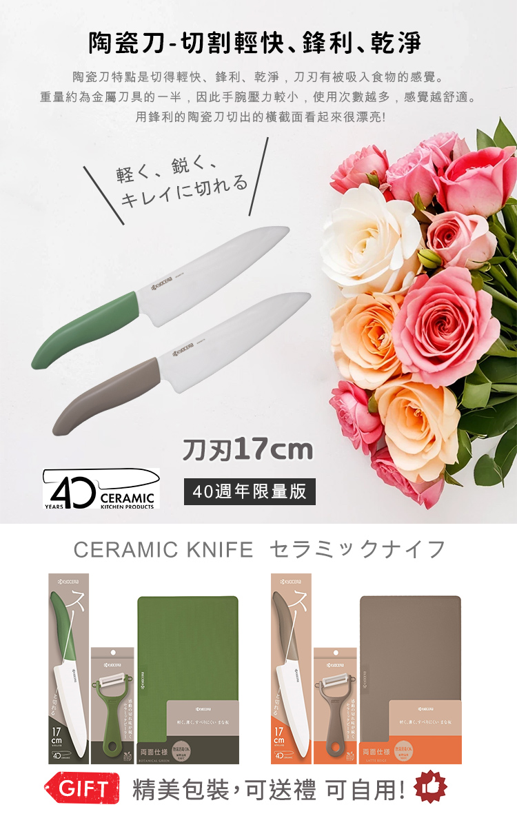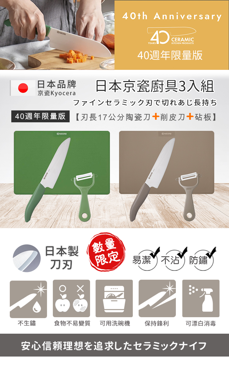 ●40週年限量版 日本製刀刃●刀體硬度高不易磨損●不易留異味,抗菌不易沾黏●陶瓷削片硬度高持久鋒利