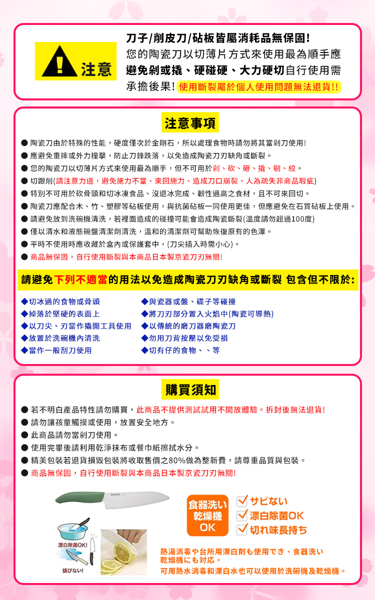 請避免下列不適當的用法以免造成陶瓷刀刃缺角或斷裂: ●切冰過的食物或骨頭 ●掉落於堅硬的表面上 ●以刀尖、刃當作撬開工具使用 ●放置於洗碗機內清洗 ●當作一般刮刀使用 ●與瓷器或盤、碟子等碰撞 ●將刀刃部分置入火焰中(陶瓷可導熱) ●以傳統的磨刀器磨陶瓷刀 ●勿用刀背按壓以免受損 ●如發現商品有磨損或破裂情形,請立即汰換已確保使用安全