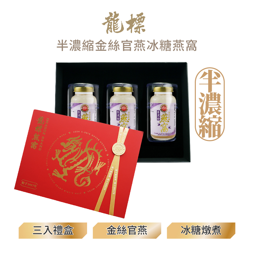 ‧濃縮燕窩,每瓶150ml,燕窩固形物含量78g,濃度高達52%‧保證100%百分百純燕窩,絕不作假!‧原瓶燉煮,保留完整營養‧國際SGS食品認證,安心使用 龍標燕窩獲新加坡60年在地「老字號」榮譽,以及國際品牌峰會的「金字招牌」之榮耀。