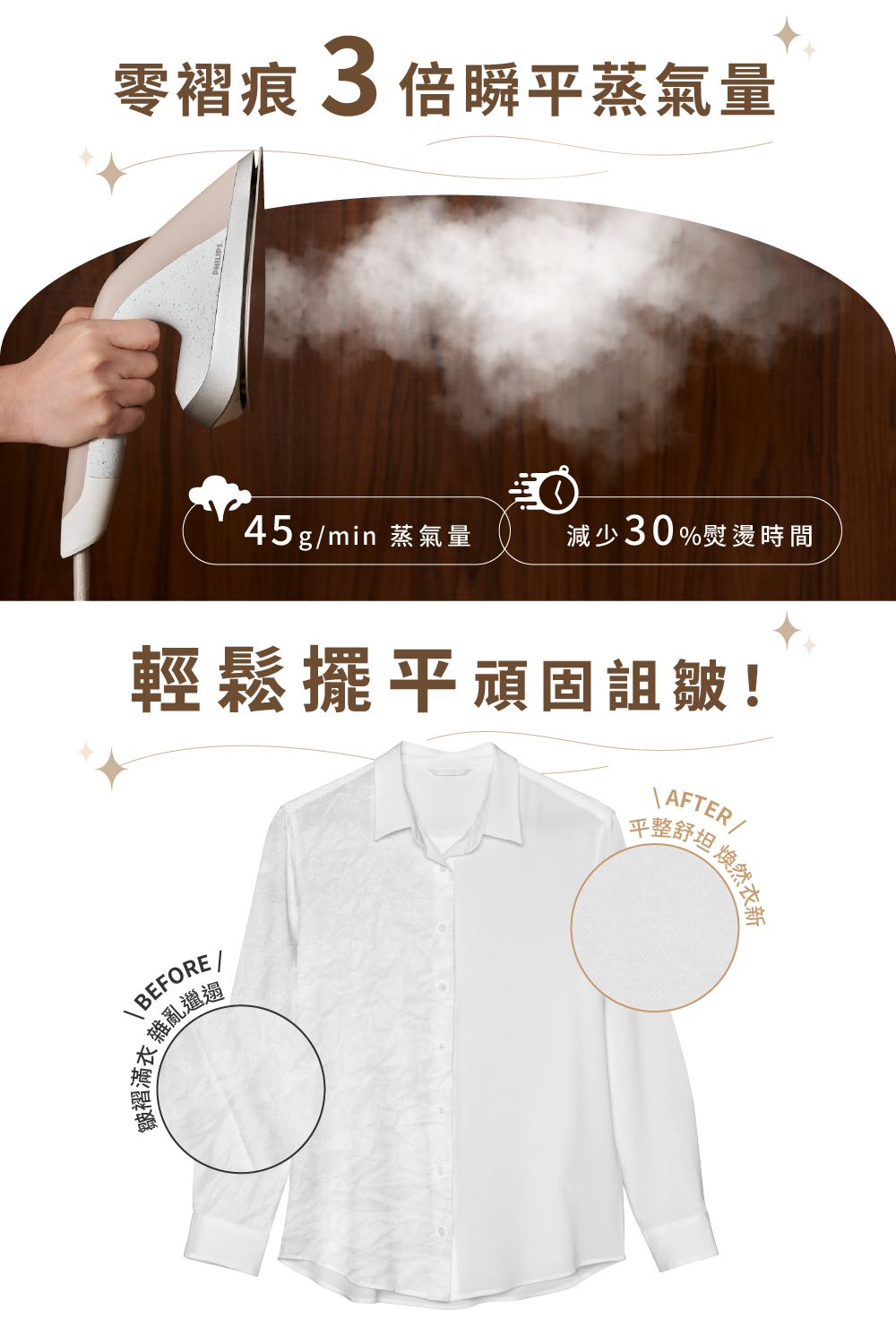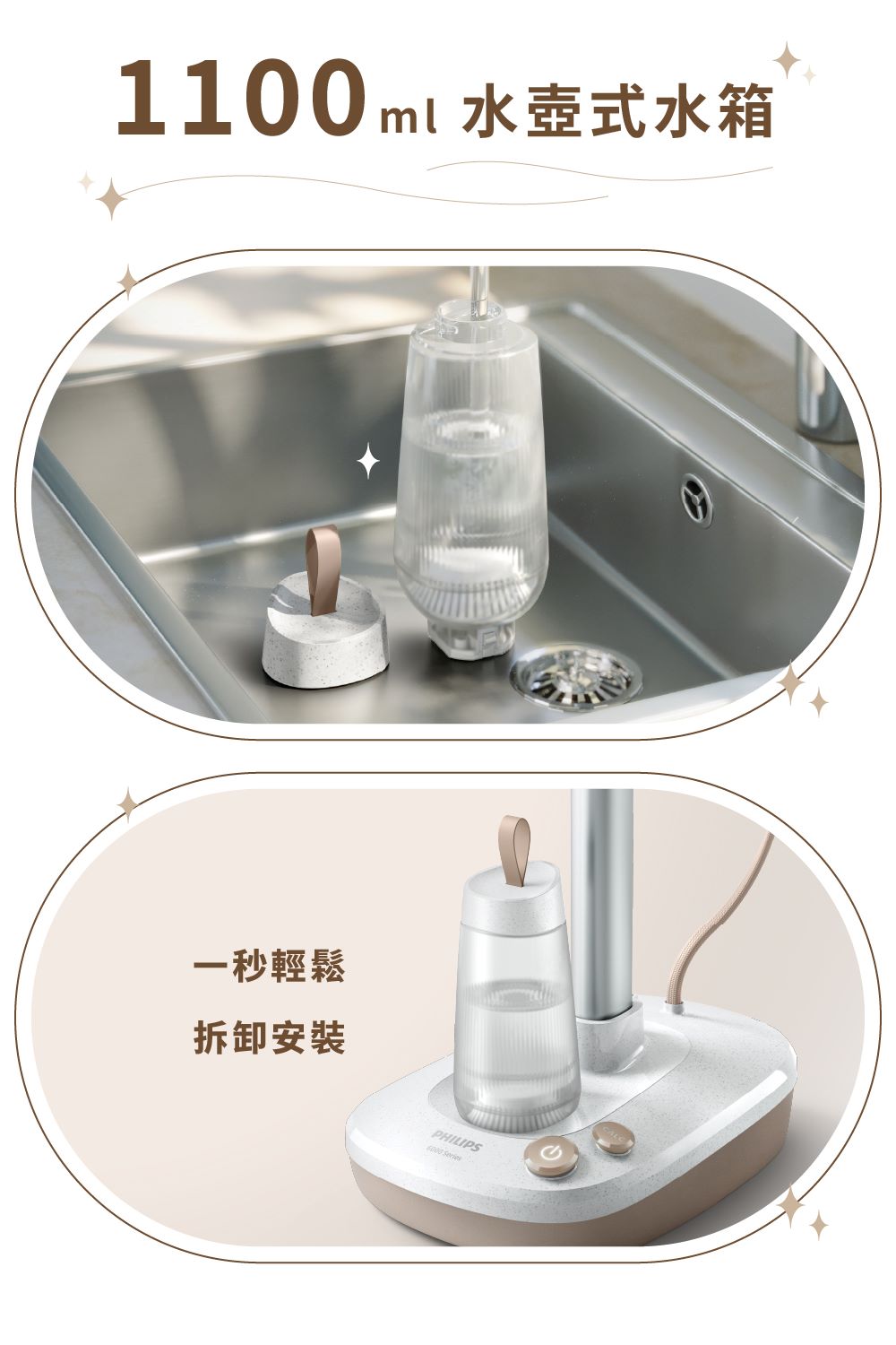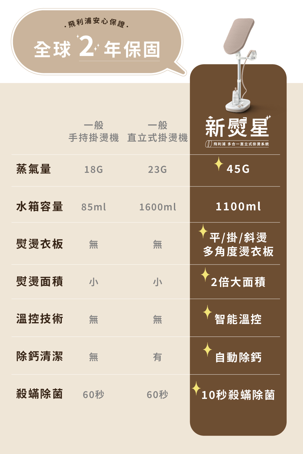 商品特色 結合熨斗+掛燙+熨燙板45g/min 超強蒸氣量 1.1L 水壺式水箱 熨燙全家大小一週的衣服量41mm大口徑與貼心提把設計OptimalTEMP®獨家專利溫控 各種布料皆適用99.9% 高效殺菌、除蟎、去味商品賣點✦ 飛利浦首創一站式高效熨燙新體驗新熨星開啟前所未有的衣美新淨界 每次出門總是被皺巴巴衣服所苦惱?使用全新推出飛利浦新熨星多合一直立式掛燙系統 AIS6010 ,一站式整合「50% 輕量化熨燙頭X 3 倍瞬平蒸氣量X多角度燙衣版」 ,為你打造熨燙「輕.快.新」體驗,每天衣物如新輕鬆完美出門!★ 熨燙新革命!一站式整合熨燙工具 一站式完美整合熨斗、掛燙蒸氣、多角度燙衣板,從準備到啟動只要 80 秒!只需掛燙的輕鬆力道,就能享受專業熨燙效果,輕鬆打造無瑕衣物!★ 多角度燙衣板 + 輕量Iron熨燙頭 ,熨燙面面俱到! 0-90度靈活調整燙衣板,輕鬆完成掛燙、平燙、斜燙,無論是長版大衣、襯衫衣領、洋裝還是褲子摺線,細節都能一絲不苟地熨燙到位。搭載2倍大面積熨燙頭與50%輕量化鋁合金設計,讓你輕鬆快速又省力,實現高效居家熨燙術!✦ 獨家三大真無痕功效,零褶痕、零焦痕、零水痕讓衣物煥然如新,每次熨燙輕鬆無憂 ◆ 零褶痕:3 倍瞬平蒸氣量,45g/min 連續蒸氣量 ,有效減少30% 熨燙時間,快速有效擺平衣物頑固皺褶! ◆ 零焦痕:OptimalTEMP® 智能溫控技術!通過500多種織物安全測試,無論是棉麻、絲綢、羊毛等各式衣料都能安心一熨到底! ◆ 零水痕: ProVelocity® 超能加熱系統!創造穿透細緻蒸氣,防止熨燙面產生冷凝水!即燙即可穿,衣物乾爽如新!★ 10秒殺蟎、除菌、去味,讓衣物清新如新 高溫蒸氣快速穿透,僅需10 秒即可高效消除細菌、蟎蟲、異味! 還能輕鬆清潔居家寢具、布套及抱枕玩偶,守護家人的健康。 智慧輕省底座設計,搭配免彎腰腳踏式啟動面板,底部加裝瞬移滾輪,移動收納、清潔更方便,為你省時、省力、省空間!★大容量水箱、智慧除鈣,輕鬆應對全家一週衣物熨燙需求 ◆ 1.1L 水壺式水箱,設計大口徑與貼心提把,一秒輕鬆快速拆裝不漏水,補水填裝更便利 ◆ 智慧除鈣功能,一鍵可自動去除水垢,防止熨燙污垢水痕,延長產品使用壽命 商品規格 品牌 PHILIPS飛利浦 型號 飛利浦直立式蒸氣掛燙機 型號 AIS6010/10產地 中國類型 直立式水箱容量 1~2L電壓 110V保固 2年保固BSMI許可字號 R3D904補充說明• 顏色: 米色 • 電壓: 110V • 外包裝尺寸(寬x高x長): 59.5 x 40.0 x 39.5 cm • 產品規格(展開):寬 42.6cm X 長 44.4cm X 高 166.7cm • 產品規格(伸縮):寬 42.6cm X 長 44.4cm X 高 124.7cm • 水箱容量: 1.1L • 連續蒸氣輸出: 45g/min • 可使用自來水: 可 • 電線長度: 1.5 m • 產品重量: 10 kg • 含包裝重量: 13.2 kg • 商品檢驗字號: R3D904Multi-angle 多角度燙衣板•連續蒸氣: 45 g/min•熨燙板規格: cm•電壓: 110 V•蒸氣輸出控制: 智能溫控+除垢功能•燙頭: 全新升級Iron+,50%輕量化、2倍大面積(196 cm☆)•可調節角度: 水平0°到垂直90°無段式自由調節 尺寸與重量•伸長後掛桿尺寸: 168 cm 備註1 上述規格如有錯誤,請以原廠公告為主備註2 為確保產品效能, 飛利浦熨斗掛燙機產品出廠前用水測試過。水箱內有水珠為正常狀況,敬請安心選購 備註3 使用產品前,請先詳閱使用手冊 ★退 / 換貨注意:。此為【家庭清潔用品】,鑑賞期之內無法提供試用,一經拆封使用,將會影響退貨權限。 依照消費者保護法規定,消費者均享有商品到貨七天鑑賞期之權益。但退回商品必須是全新狀態且完整包裝 (保持商品、附件、包裝、廠商紙箱及所有附隨文件或資料之完整性)。