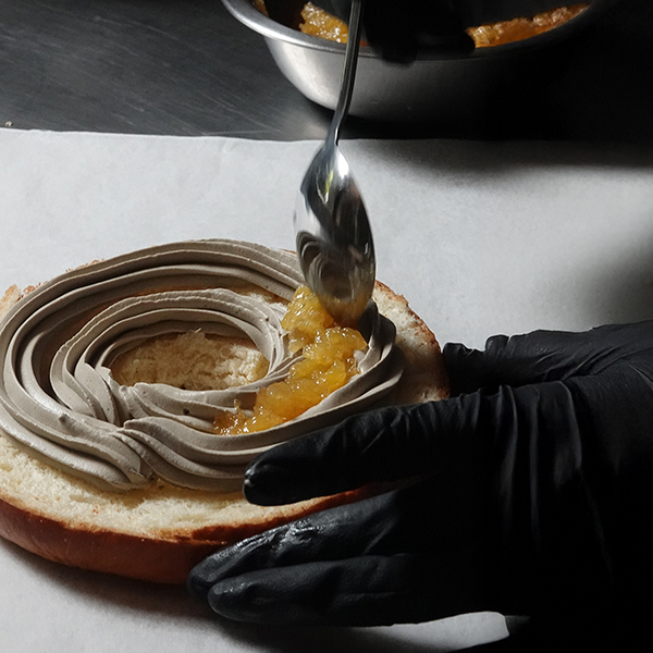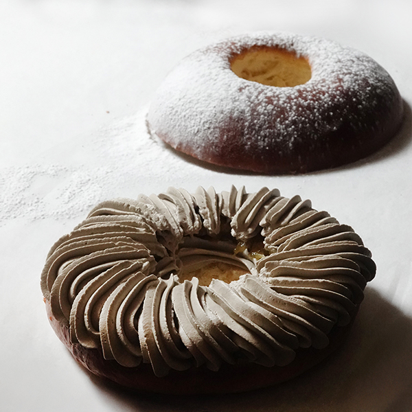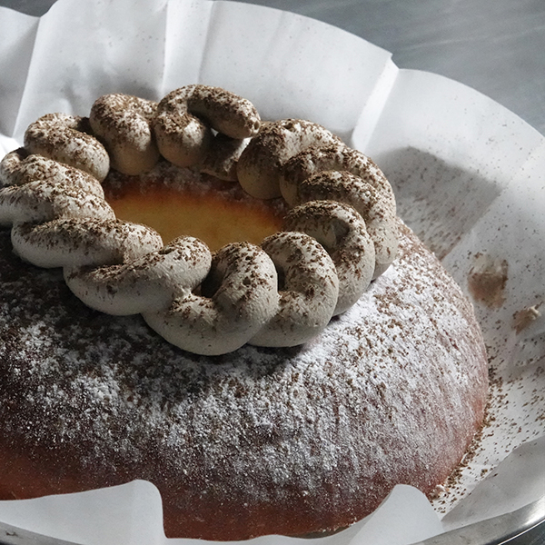 靈感來自三王節的傳統甜點,帛絲翠以烏龍茶的焙香深度融合鳳梨的清香果韻,重現節慶中優雅而層次豐富的甜味風景。主體採用日清百合花粉,經發酵過程展現細緻麥香;口感介於貝果的彈與蛋糕的柔之間,咀嚼時能感受到麵香的延展與細膩;內層夾入以法國 35% 動物鮮奶油打發的香緹,拌入馬斯卡彭起司,使奶香濃郁滑順;手工鳳梨餡以新鮮果肉小火慢熬,保留果肉纖維與焦糖氣息,讓香氣更豐富、口感更立體。