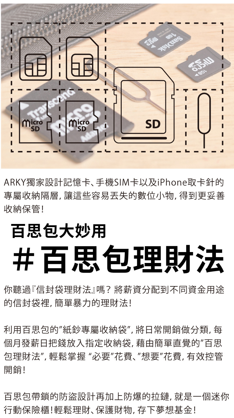 ◆ 防爆拉鍊×防盜拉鍊密碼鎖設計◆ 採用TPO強韌無毒環保材質防割穿內版◆ 獨家設計紙鈔、卡片等活頁收納袋◆ 特製SIM卡、記憶卡小物專屬隔層◆ 運用紙鈔收納袋分類理財 兼具行動保險箱功能