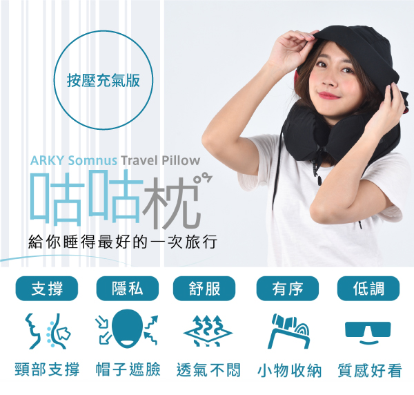 ✨ 「送他/她一份旅途中最自在的守護」💨 ARKY Somnus 咕咕旅行枕-按壓充氣版,按壓充氣設計搭配兩段連帽遮光,與親膚天絲 莫代爾枕套,讓飛機、火車或汽車旅途中的短暫休息也能深度釋放。🧳 隱藏式收納設計,方便攜帶也讓頸部支撐更貼合。🎂 生日、🎄 聖誕交換禮物或 🧳 長途旅行前,送給愛旅遊的他/她,這份禮物不只是枕頭,更是一份關於「安心放鬆」的承諾。