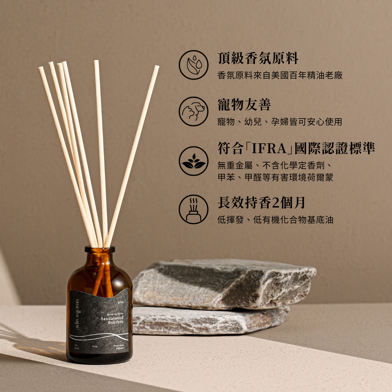 smellscape擴香瓶的基底特別選用低揮發、低有機化合物,溫和不刺激呼吸道、不增加身體負擔,讓有小孩寵物的空間也能安心使用。
