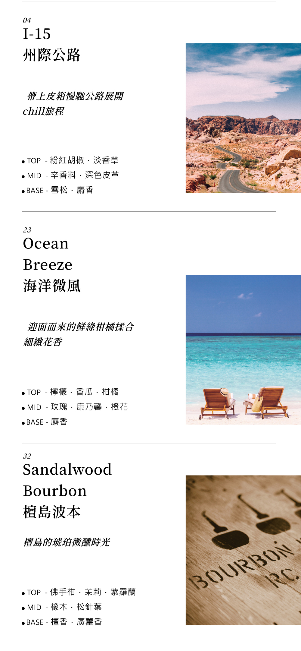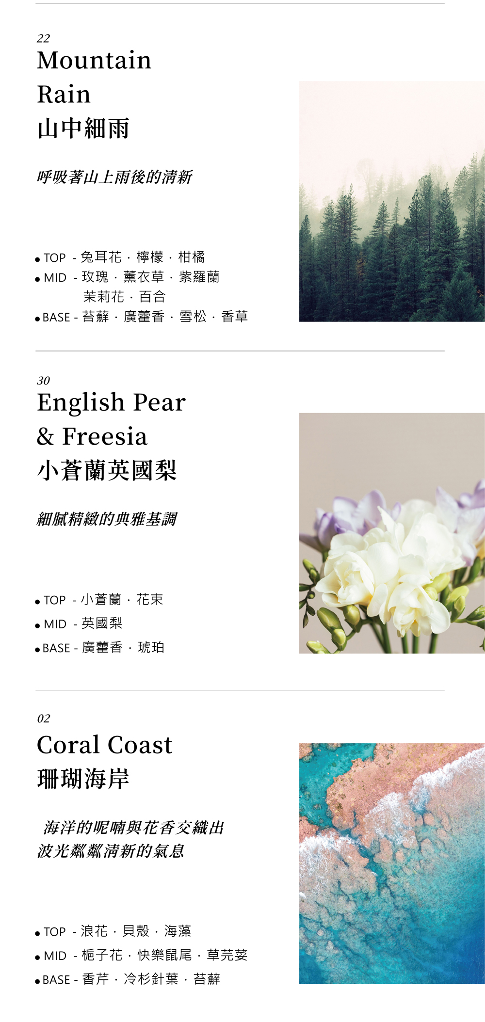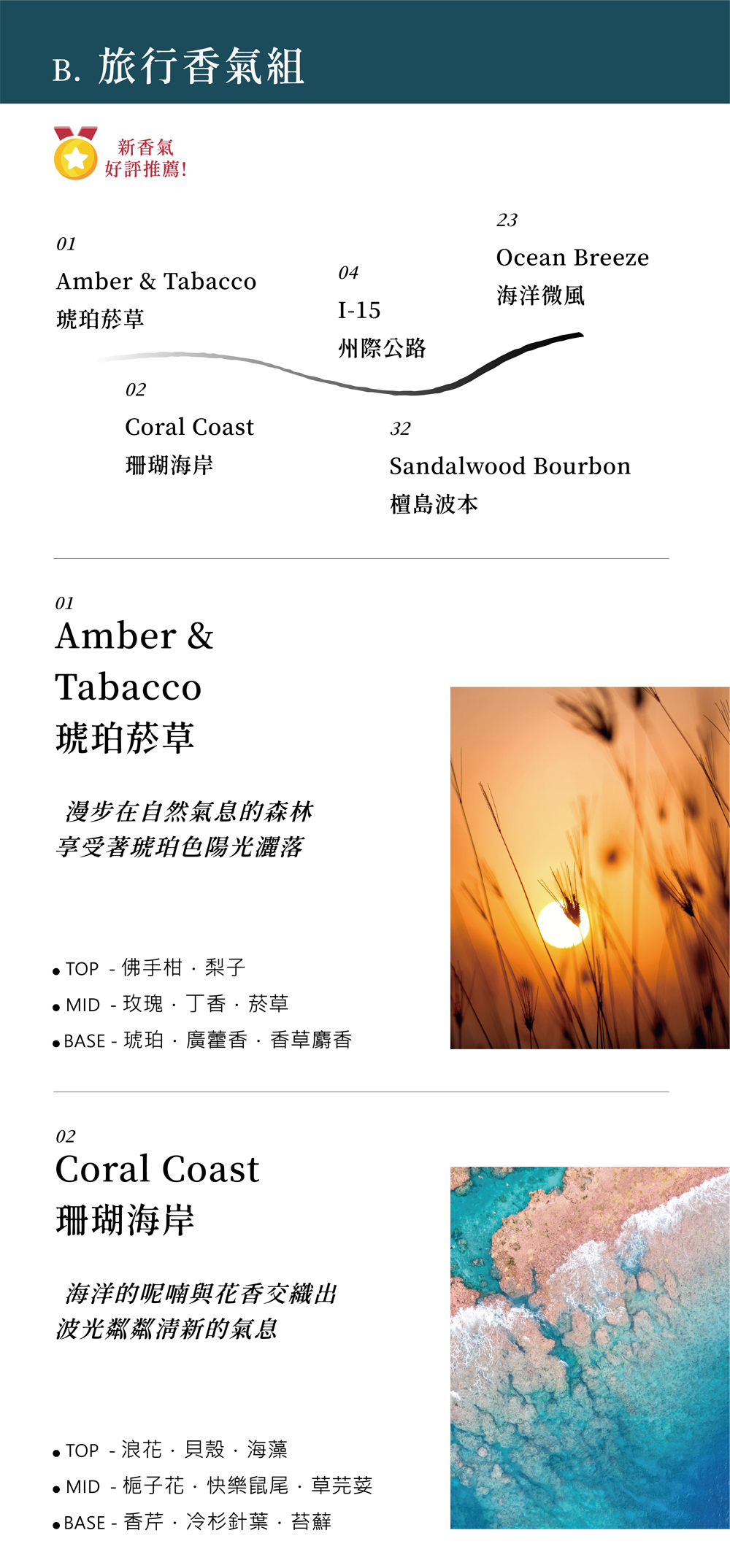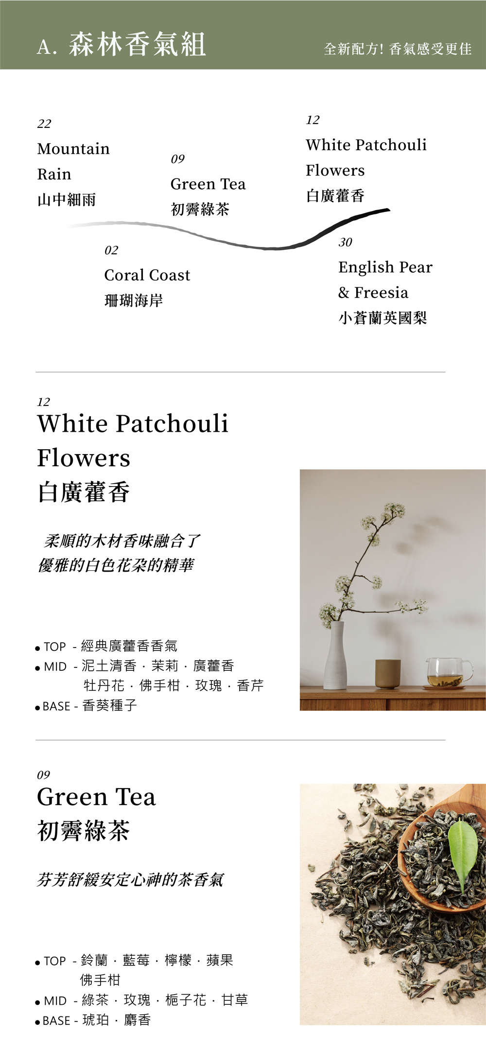 兩款香氣組合:【 A. 森林香氣 🌲 】經典香氣 ‧ 全新配方!山中細雨、白廣藿香、初霽綠茶、小蒼蘭英國梨、珊瑚海岸【 B. 旅行香氣 ✈️ 】全新香氣 ‧ 好評推薦!琥珀菸草、珊瑚海岸、州際公路、海洋微風、檀島波本