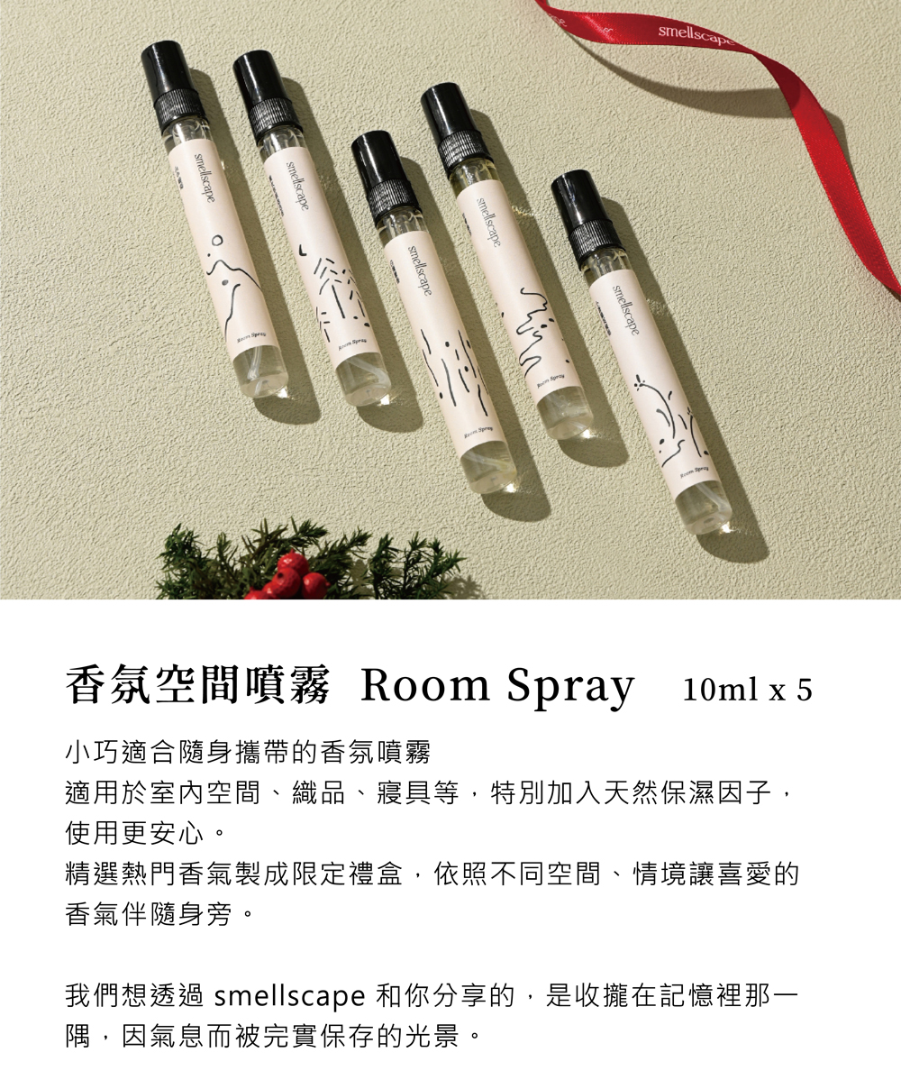 ◌ 品名: smellscape香氛噴霧禮盒(五入組)禮盒尺寸:21cm x 12cm x 5cm◌ 容量:10ml ± 5% x 5◌ 用途:天然溫和的空間噴霧,噴撒於空氣中、織品上,增添宜人香氣◌ 成分:專利無菌水、香水等級香氛、天然海藻保濕因子、天然抗氧化劑、甘油◌ 原料: 美國◌ 製造地: 台灣 (PIC/S GMP 合格工廠製造)
