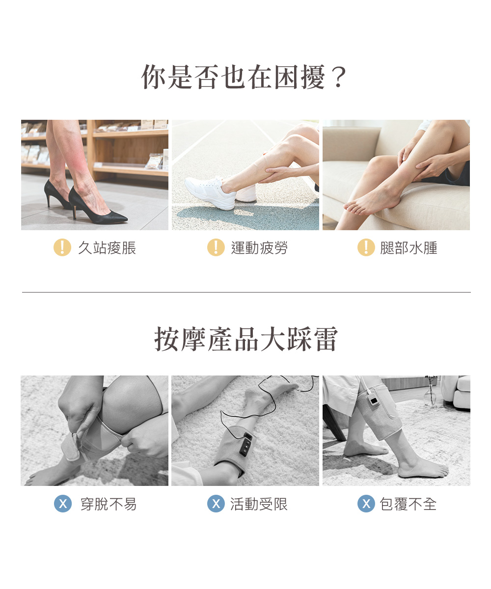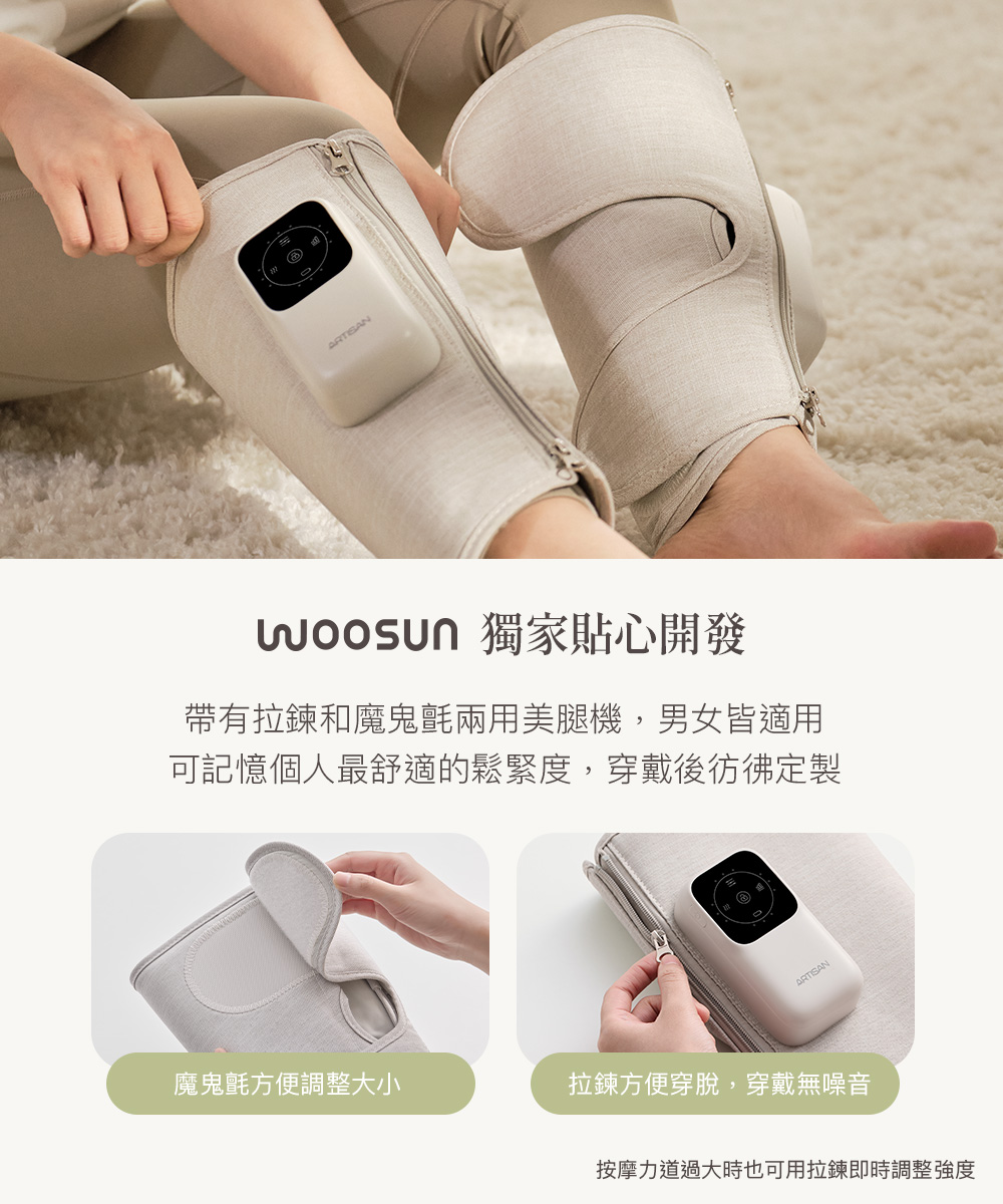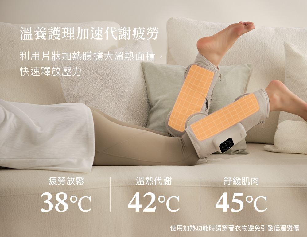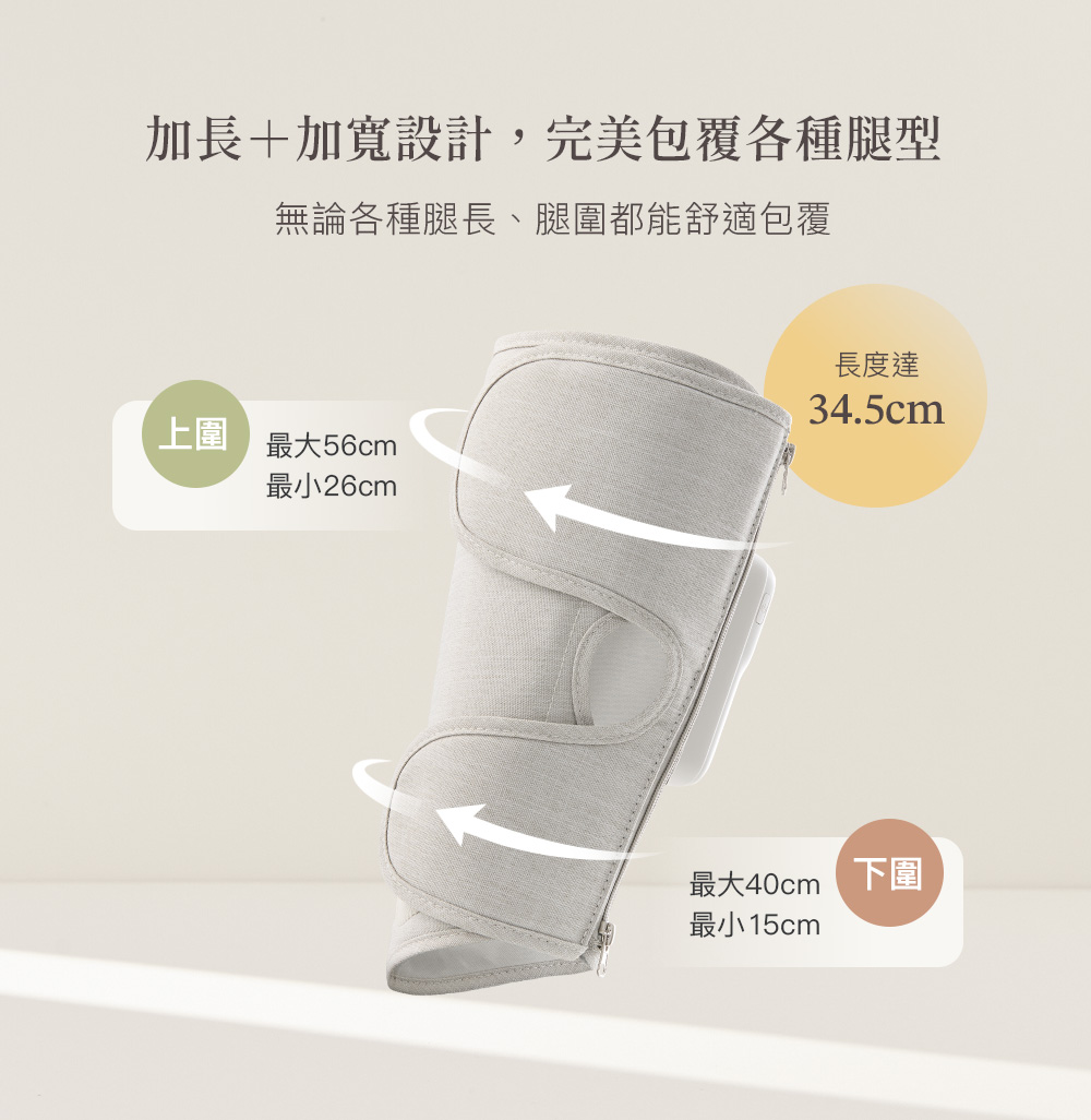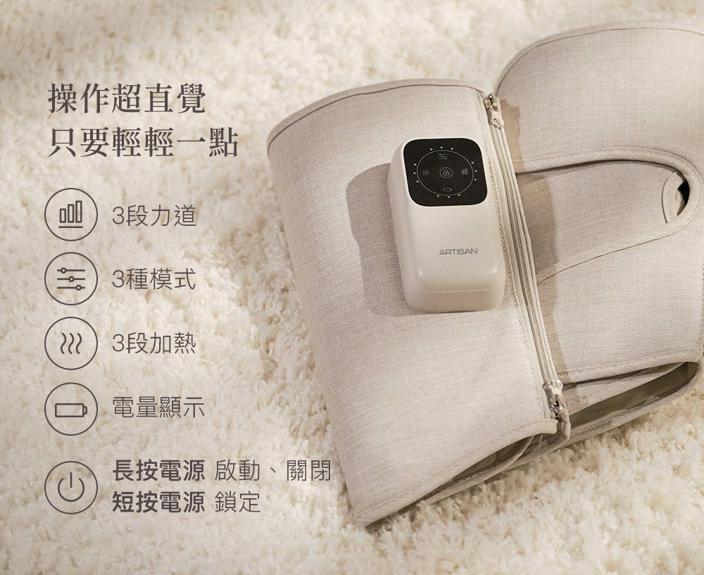 .一鍵操作,簡單便利.雙向拉鍊方便穿脫,記憶舒適尺寸.強力魔鬼氈調整,自由貼合.加寬加長設計,腿長腿圍舒適包覆.左右腿獨立氣囊,按壓更精準.3段力道 × 3種模式 × 3段加熱.2.7L強勁氣泵,深層舒緩水腫與疲勞.2500mAh電量/135分鐘續航,可使用9個循環.親膚透氣布料,易清潔耐用.50dB低噪氣泵.Y型充電線,雙腿同步充電.醫用級TPU氣囊:耐磨、耐高溫、高彈性.可摺疊收納,攜帶方便.電量顯示設計